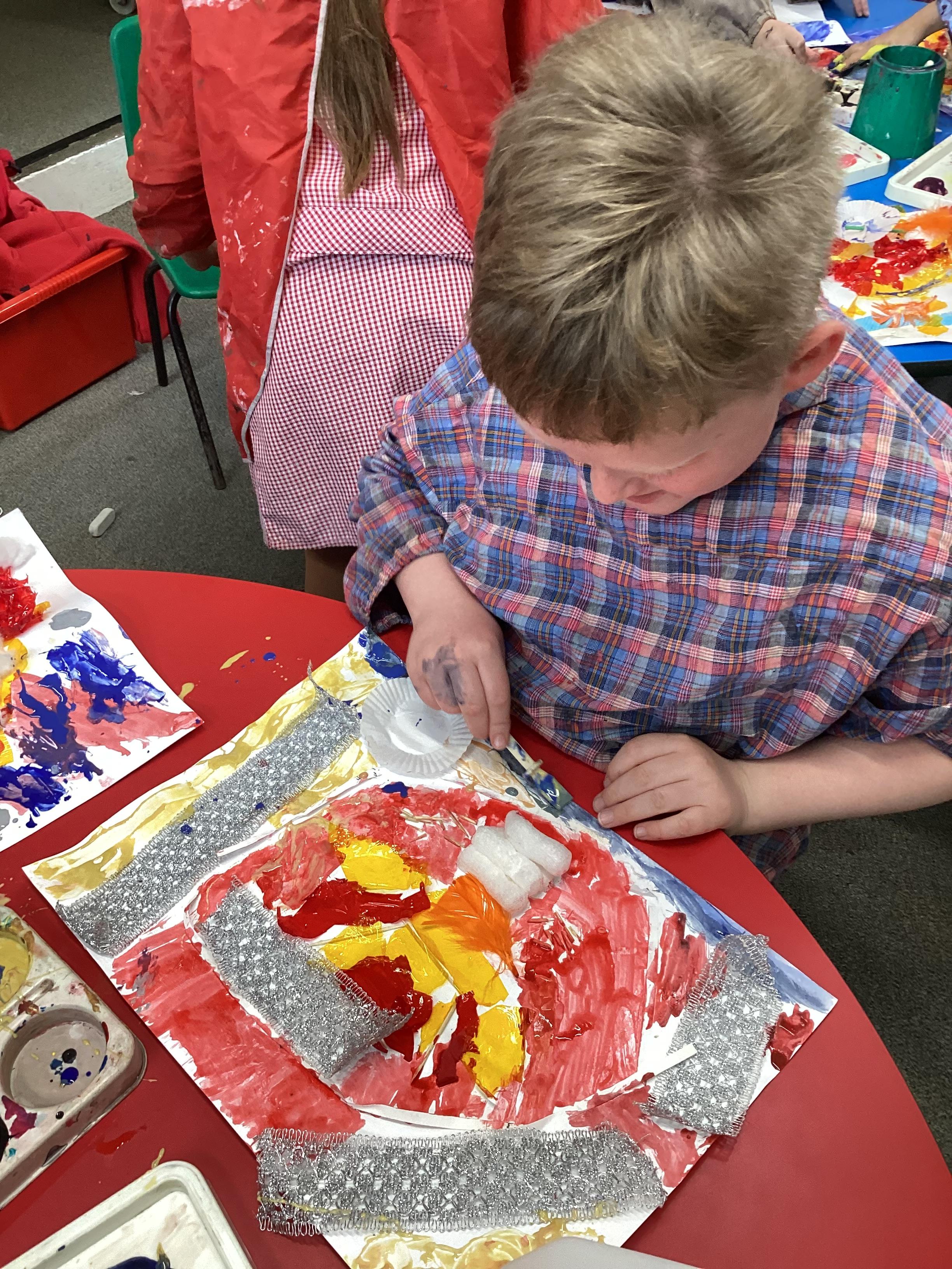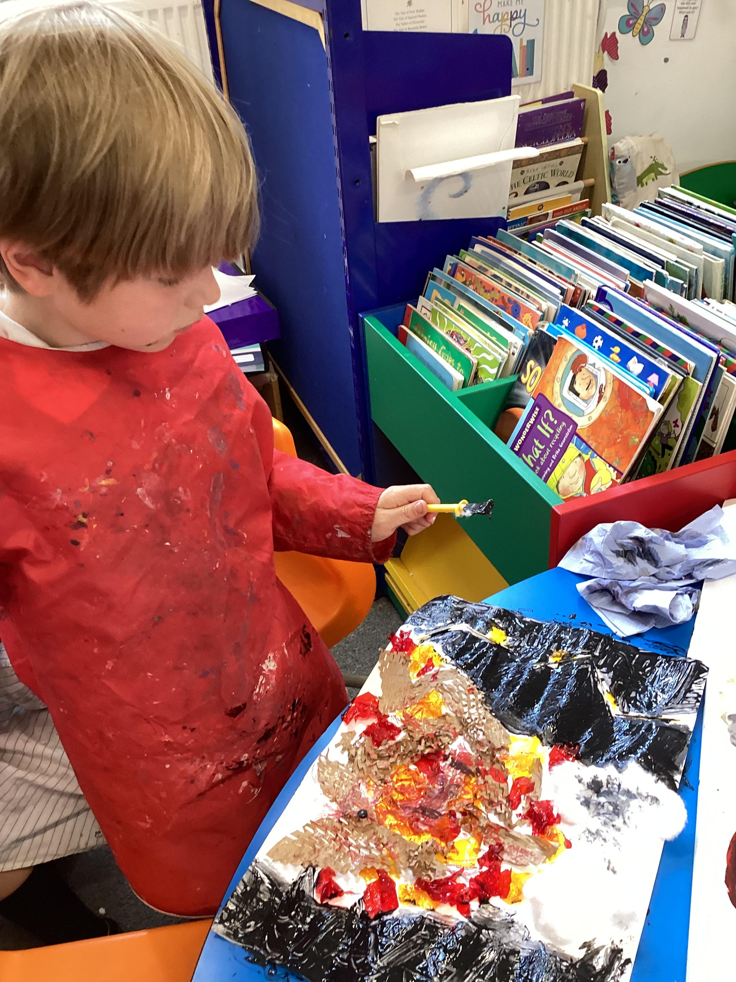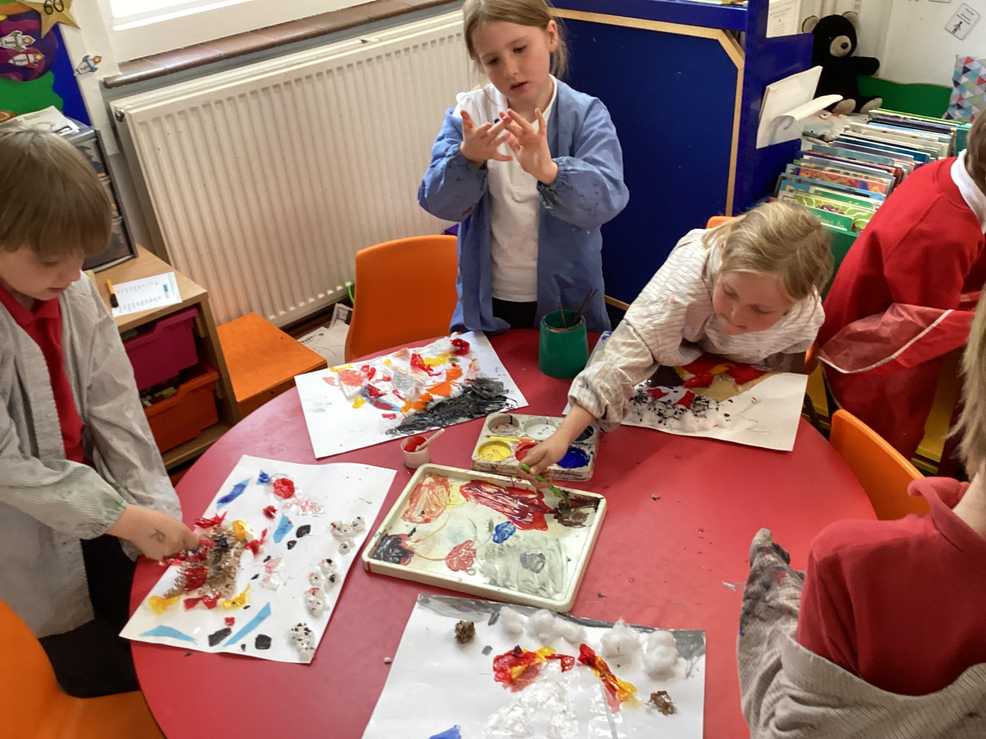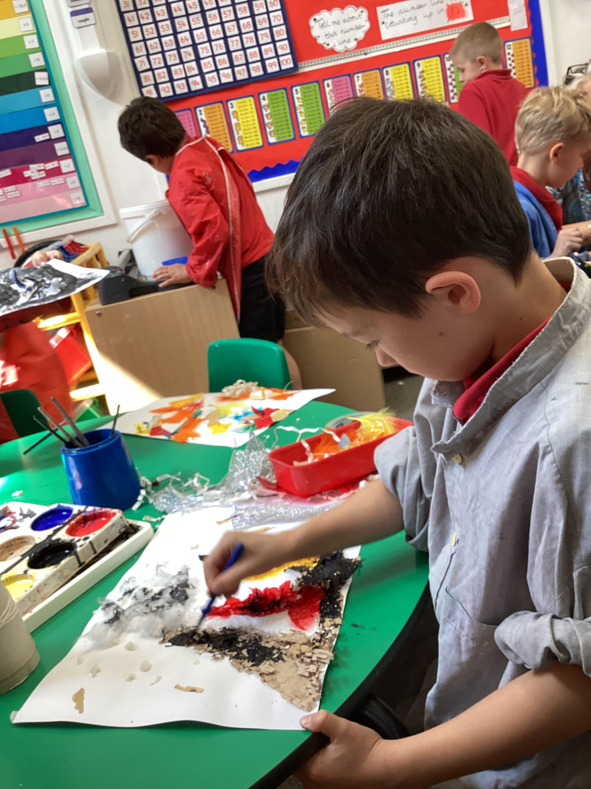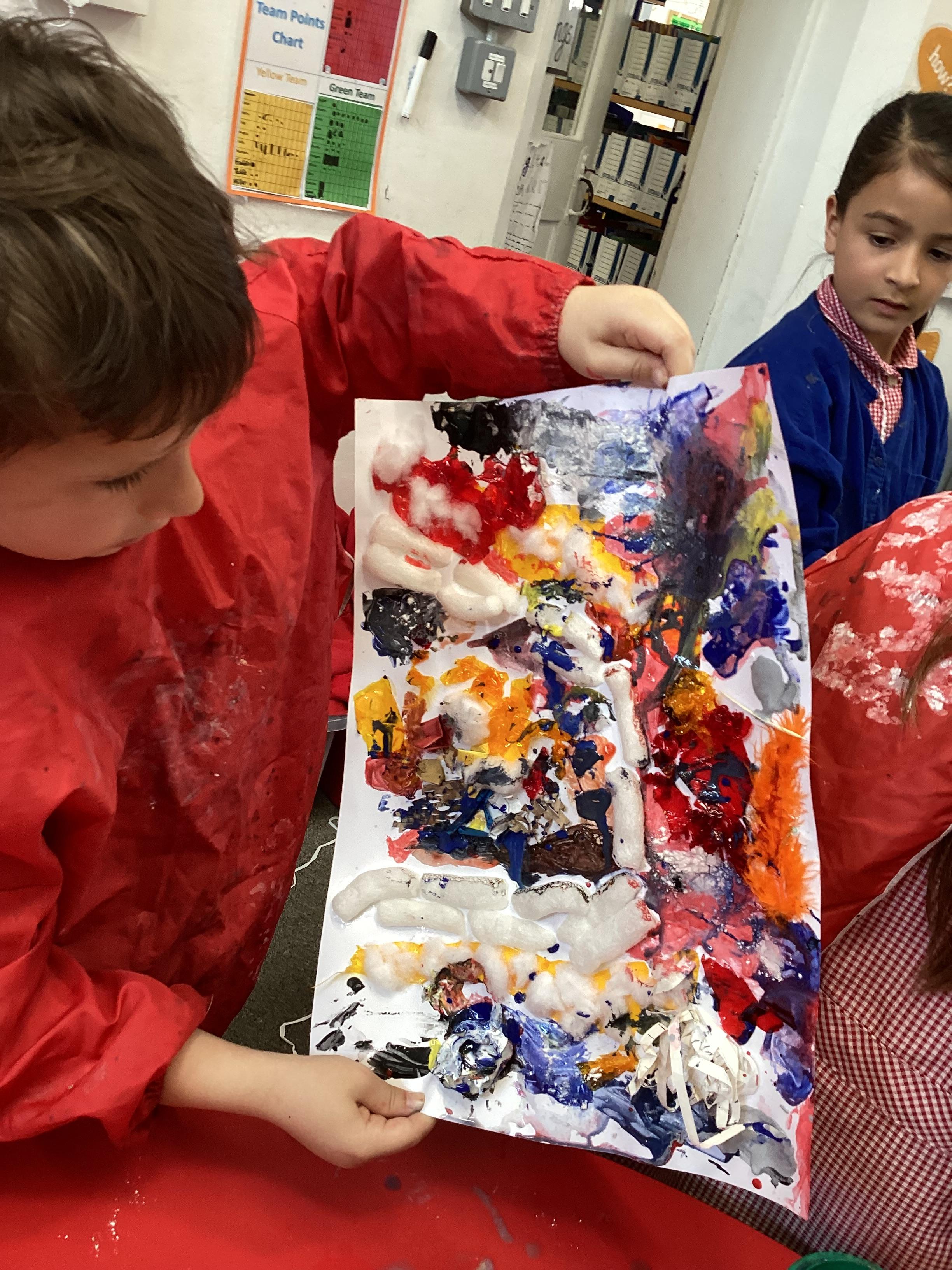 Our current topic is "Violent Volcanoes". We have been exploring the abstract textural art of acclaimed artist Frank Bowling, and, after experimenting with hot/cold colour mixing, and collage, we created our own abstract textured artwork representing "The idea and feeling of a Volcano". We had GREAT FUN exploring different ways of applying and thickening paint , trying to avoid using brushes, and even added dental plaster to our creations to add more texture. (Miss Burrough is still tidying the classroom!!!)
