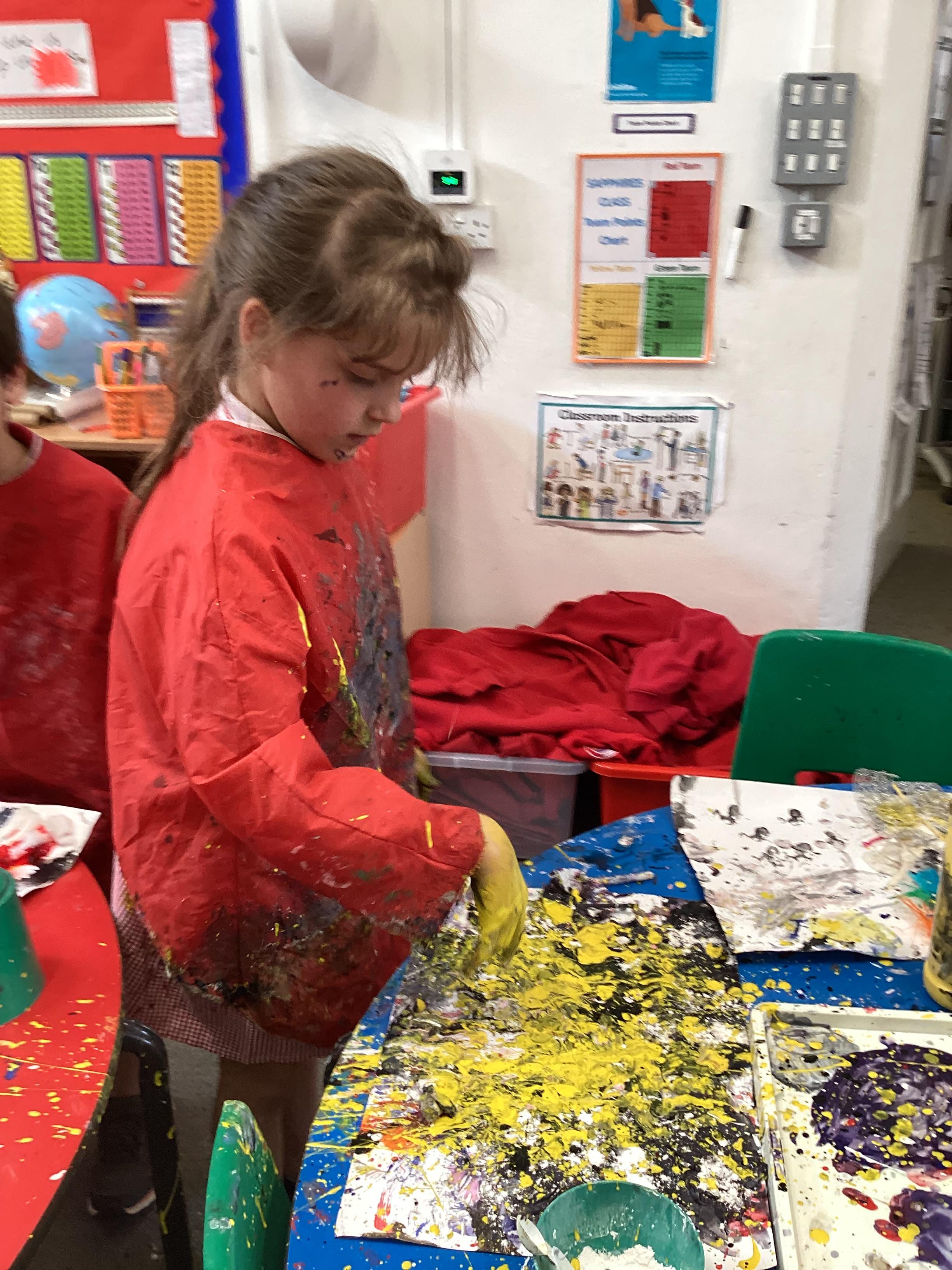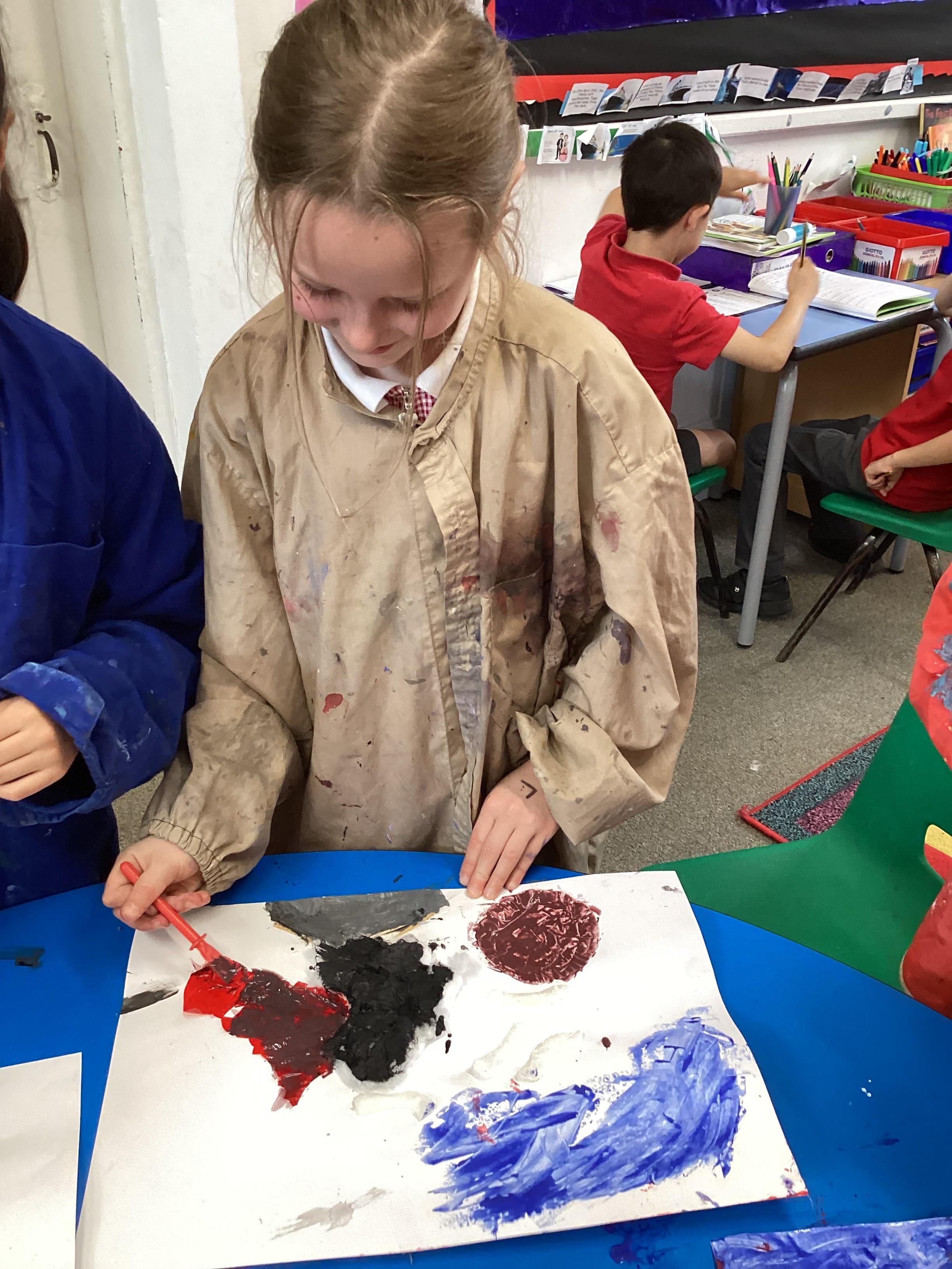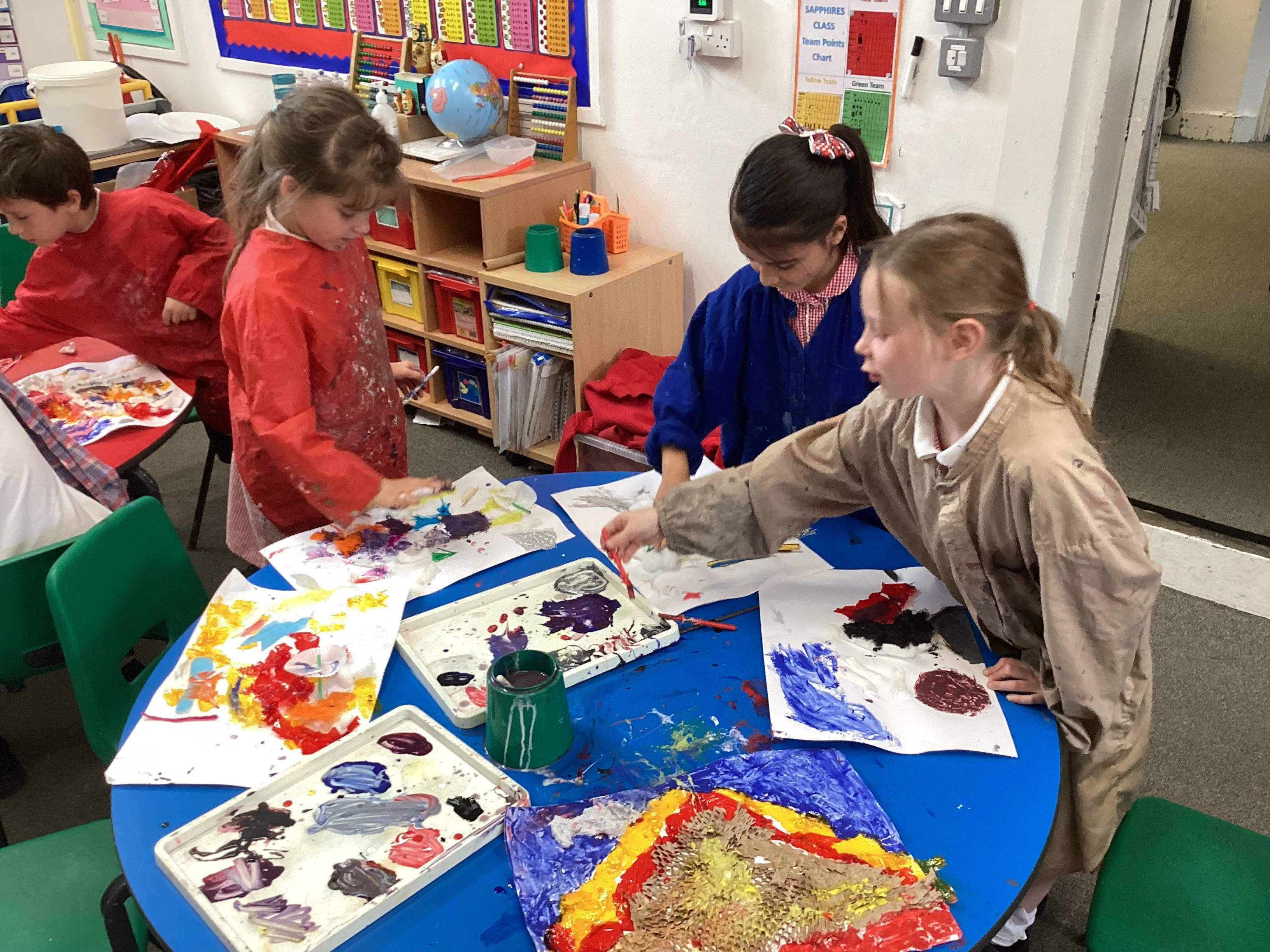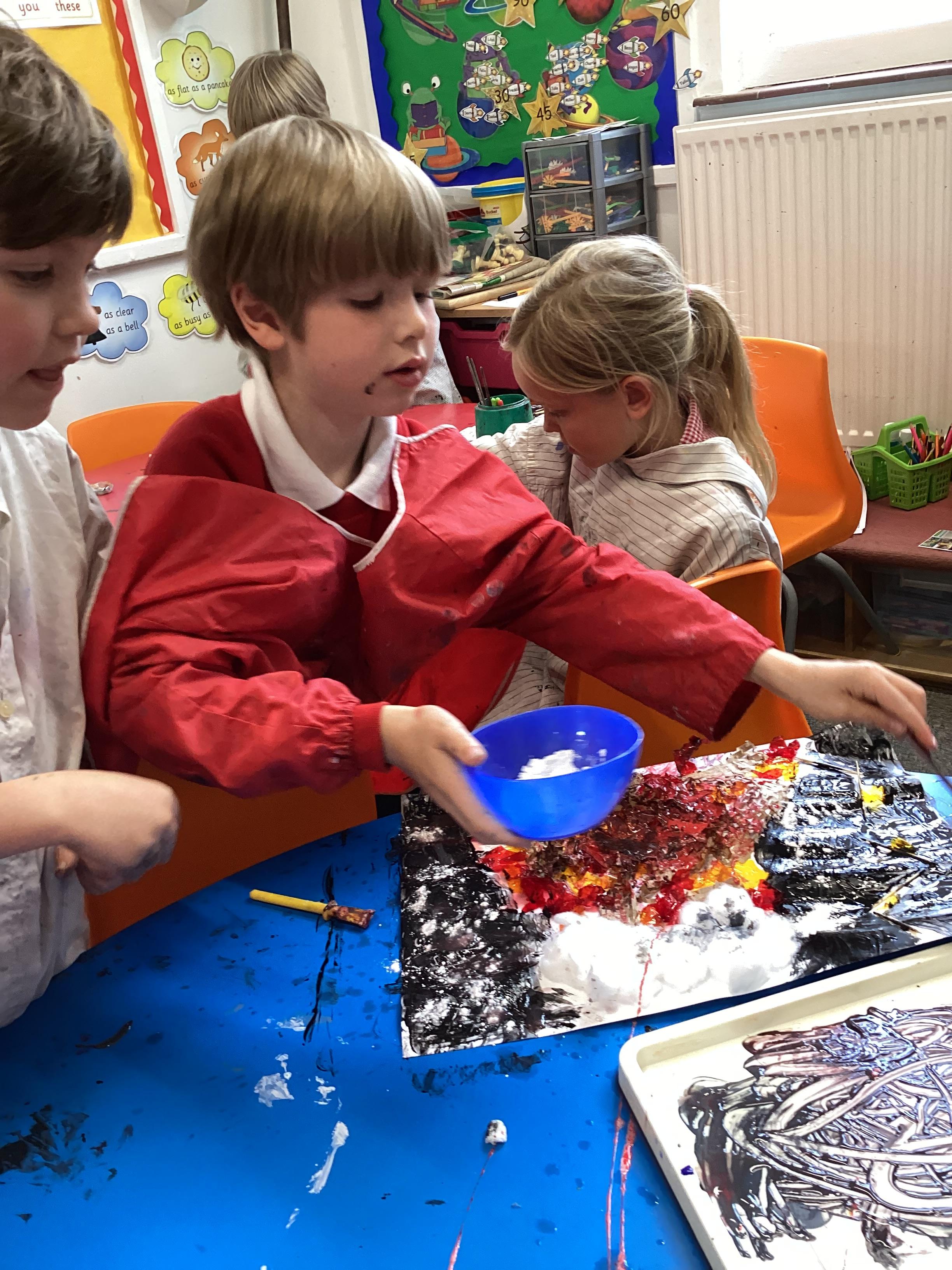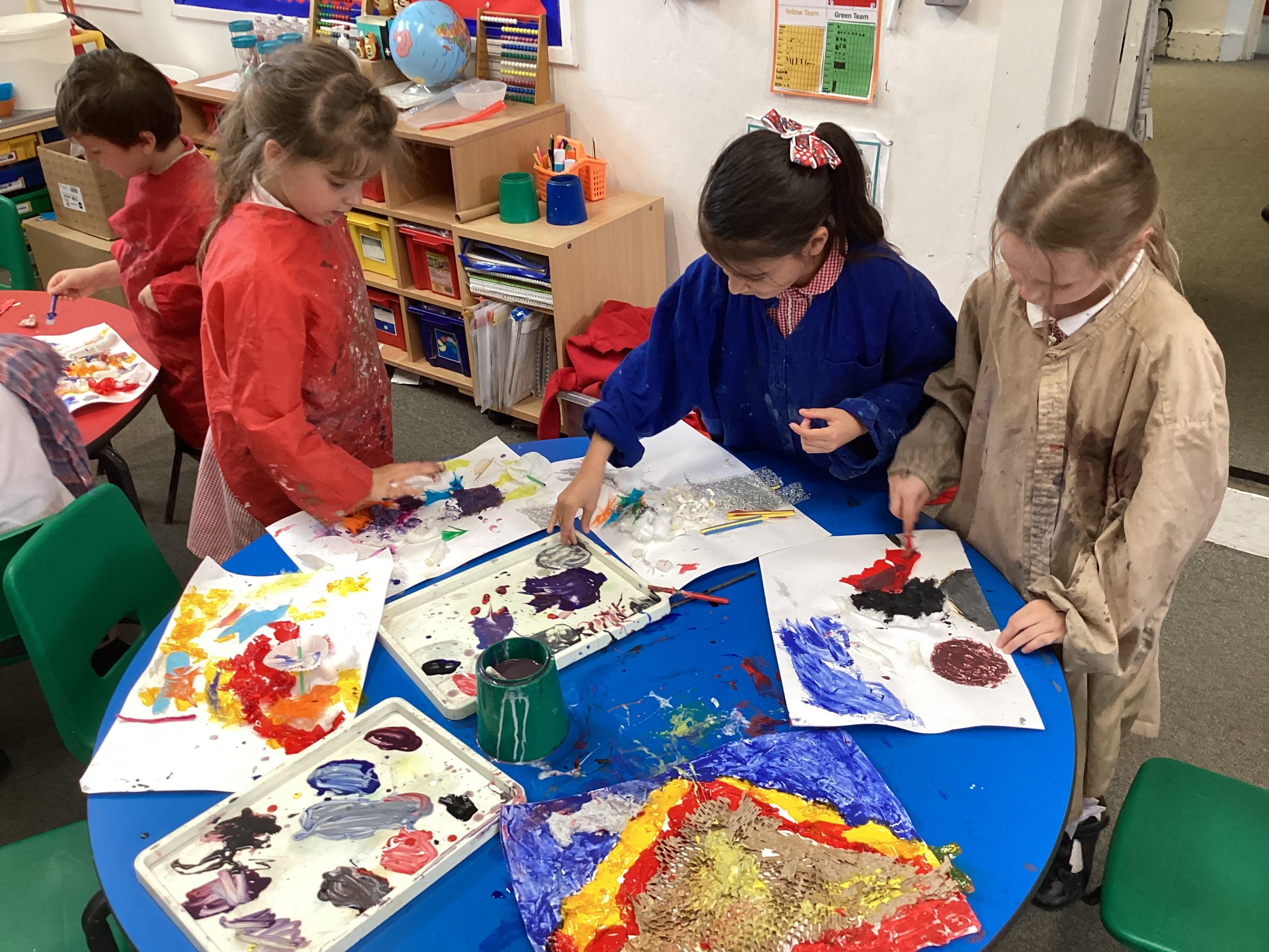Our current topic is "Violent Volcanoes". We have been exploring the abstract textural art of acclaimed artist Frank Bowling, and, after experimenting with hot/cold colour mixing, and collage, we created our own abstract textured artwork representing "The idea and feeling of a Volcano". We had GREAT FUN exploring different ways of applying and thickening paint , trying to avoid using brushes, and even added dental plaster to our creations to add more texture. (Miss Burrough is still tidying the classroom!!!)