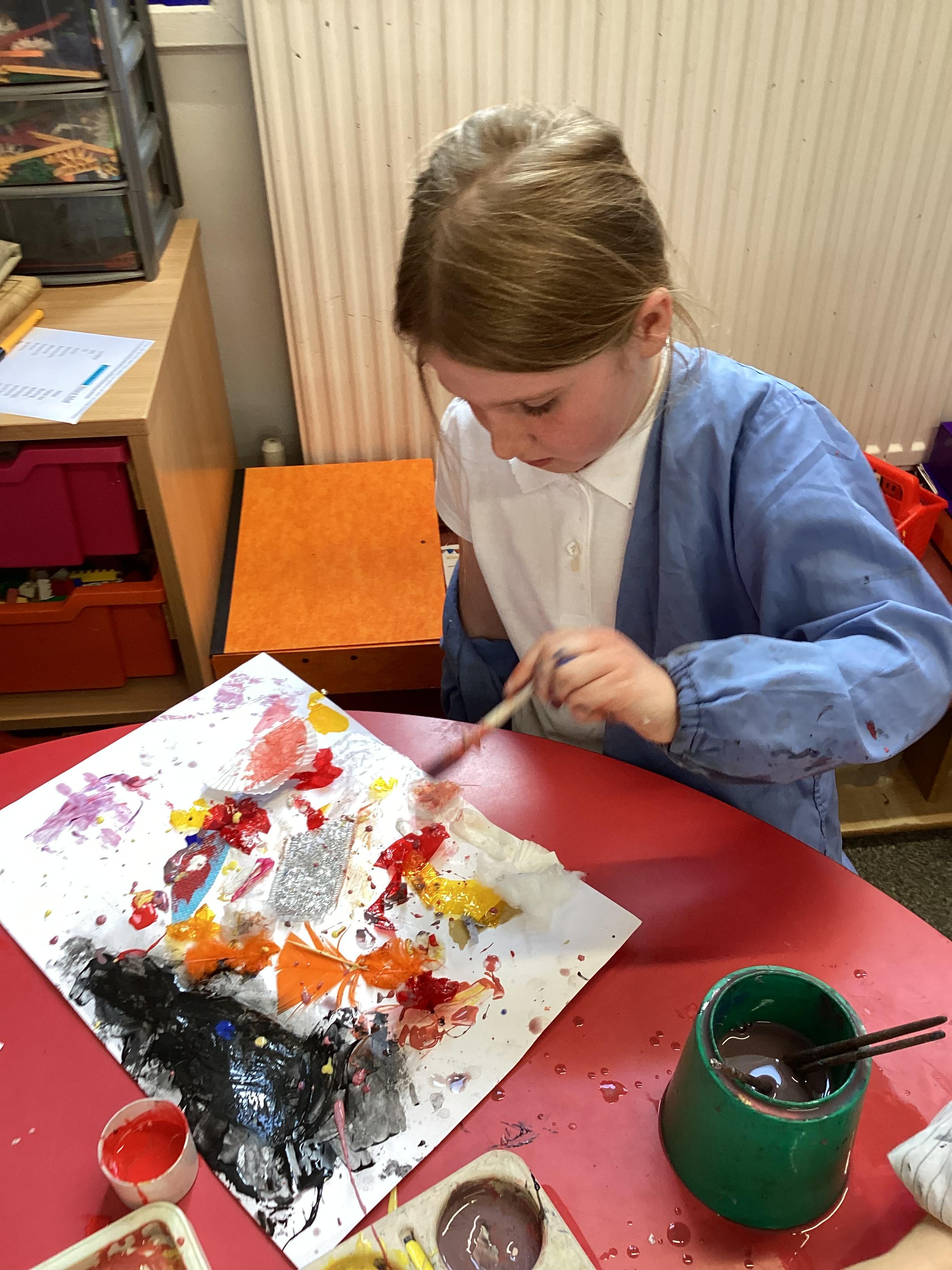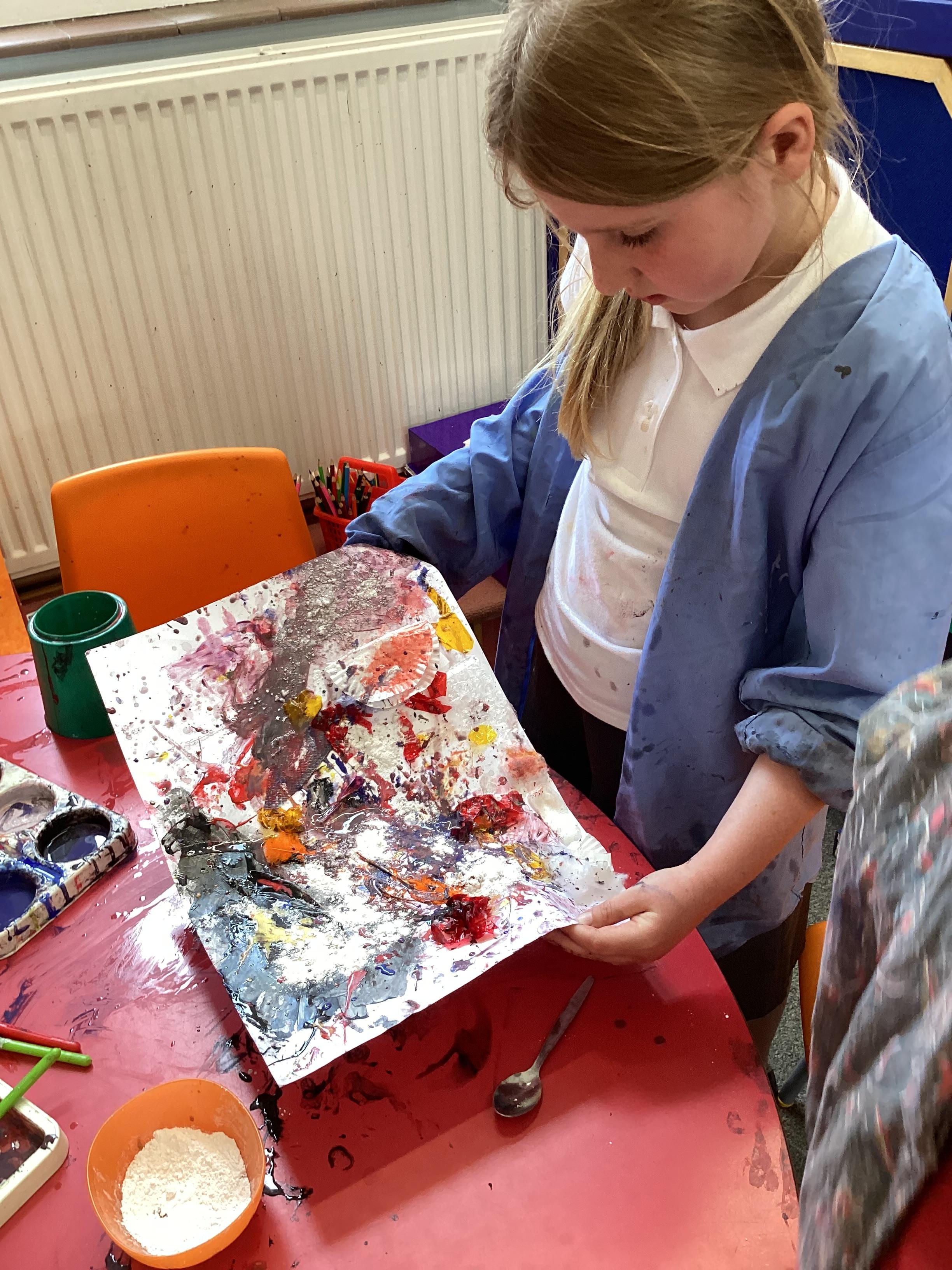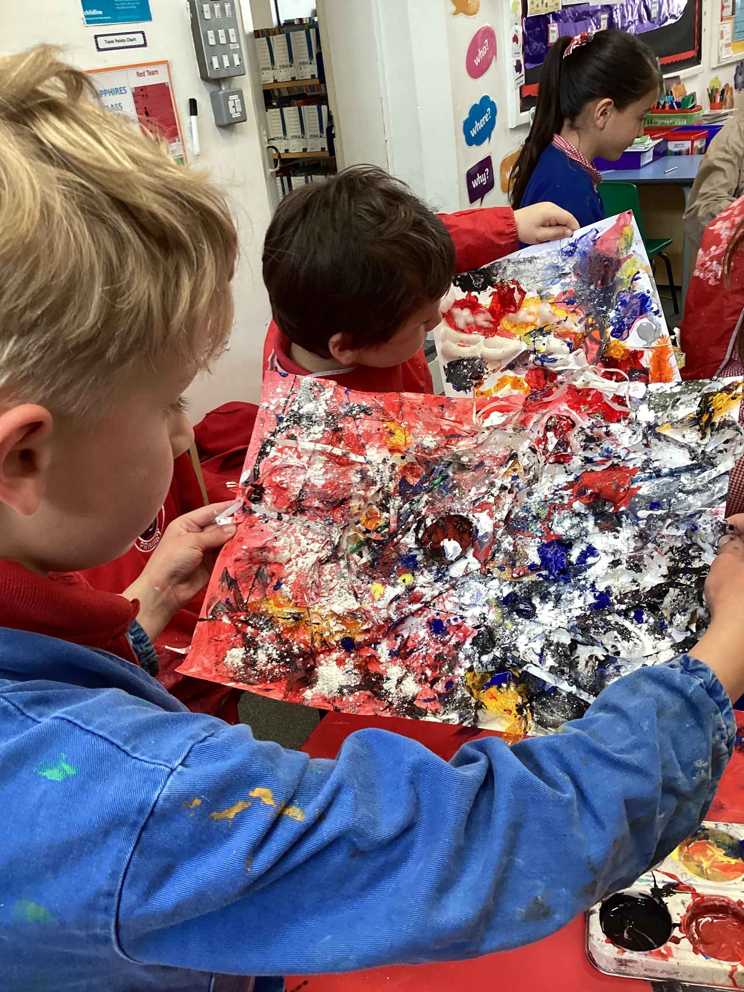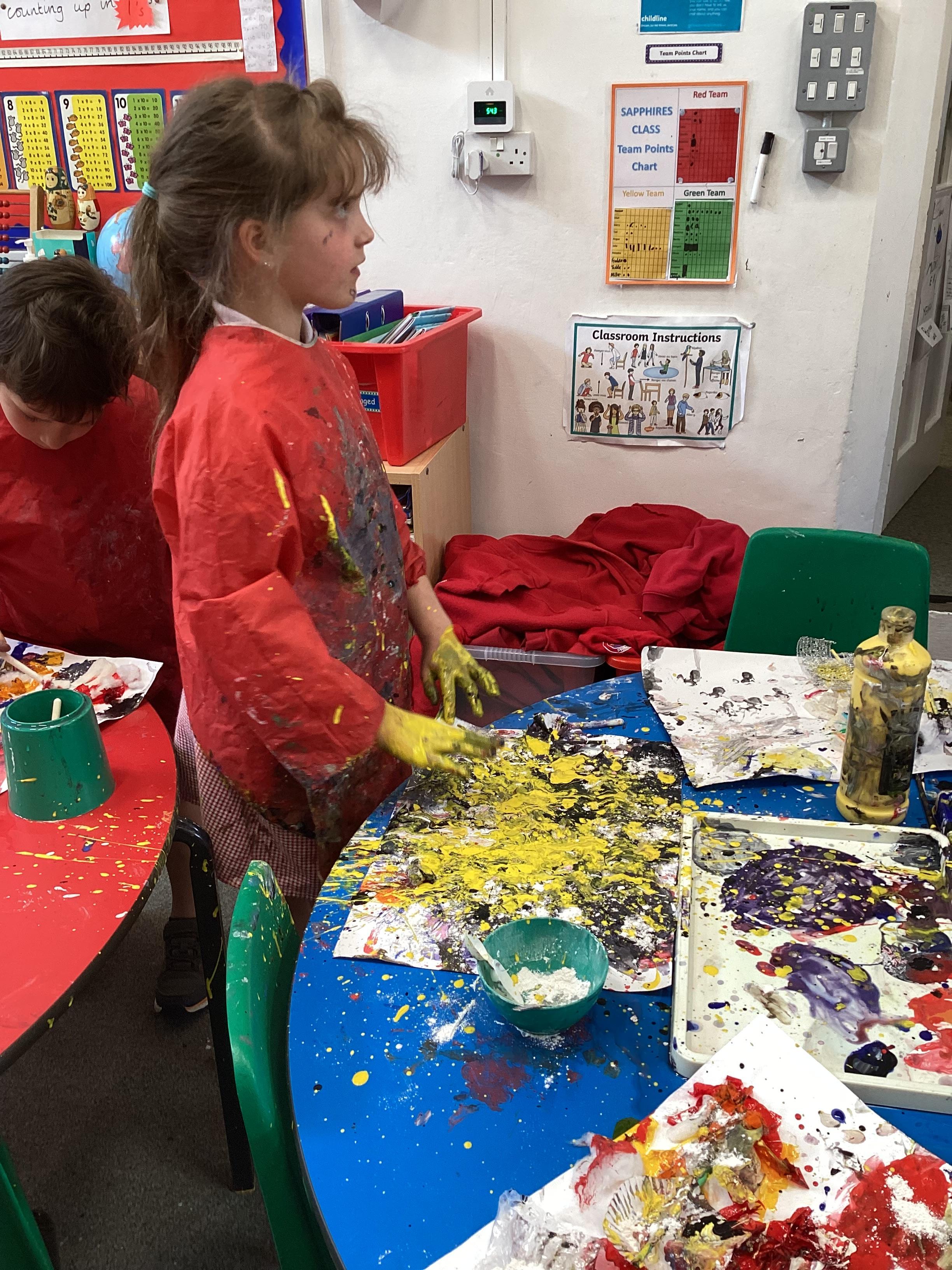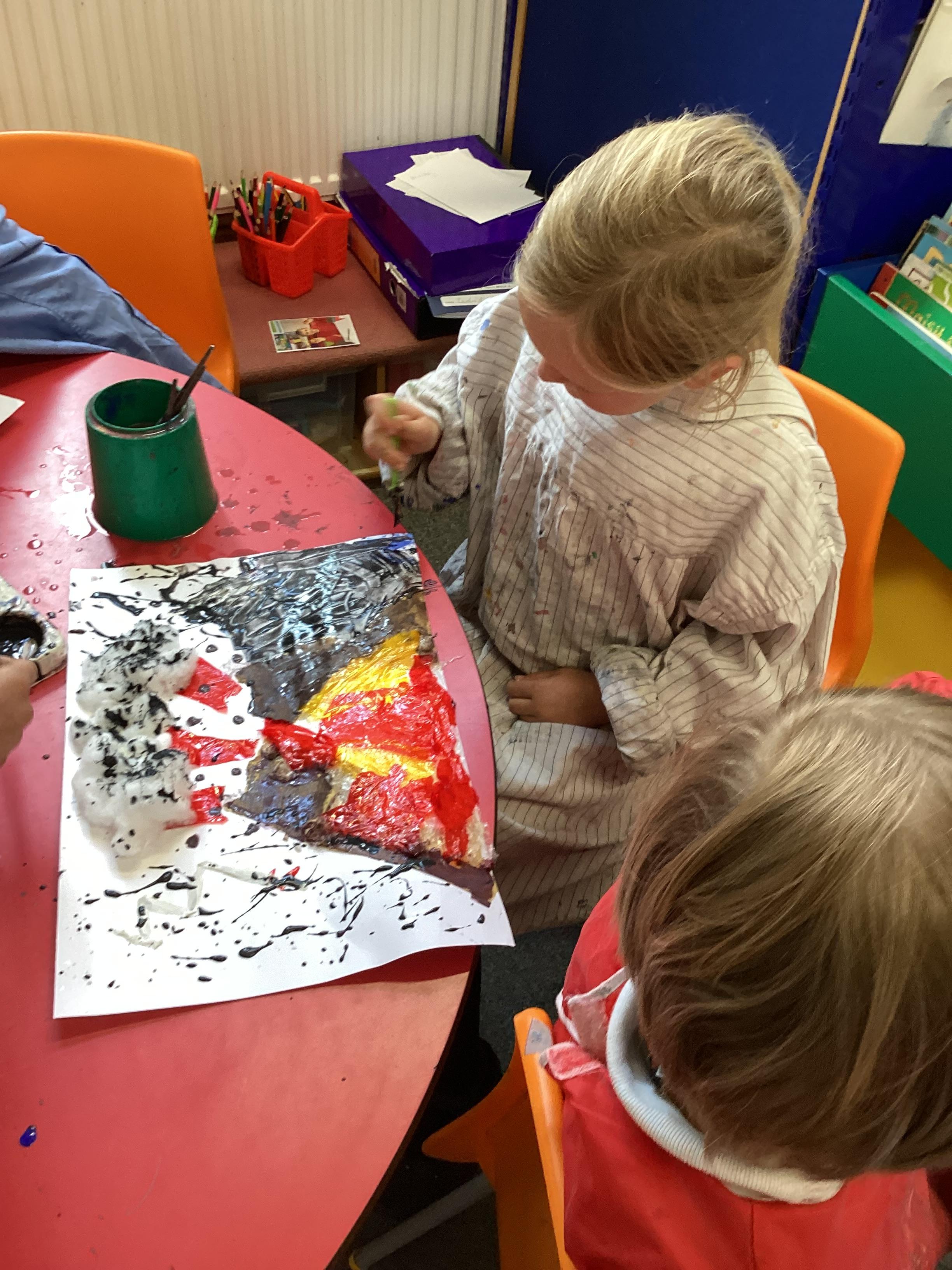 Our current topic is "Violent Volcanoes". We have been exploring the abstract textural art of acclaimed artist Frank Bowling, and, after experimenting with hot/cold colour mixing, and collage, we created our own abstract textured artwork representing "The idea and feeling of a Volcano". We had GREAT FUN exploring different ways of applying and thickening paint , trying to avoid using brushes, and even added dental plaster to our creations to add more texture. (Miss Burrough is still tidying the classroom!!!)