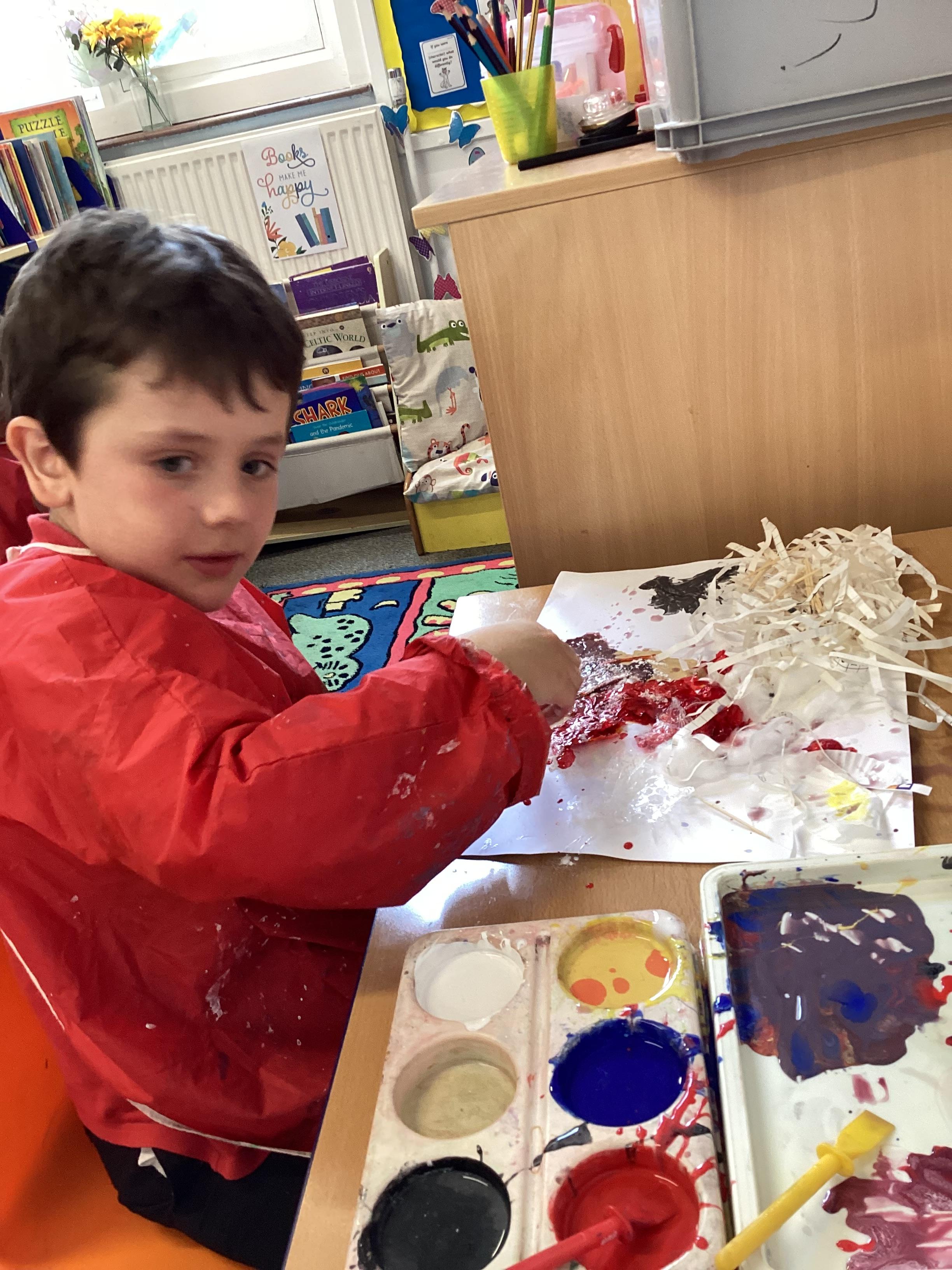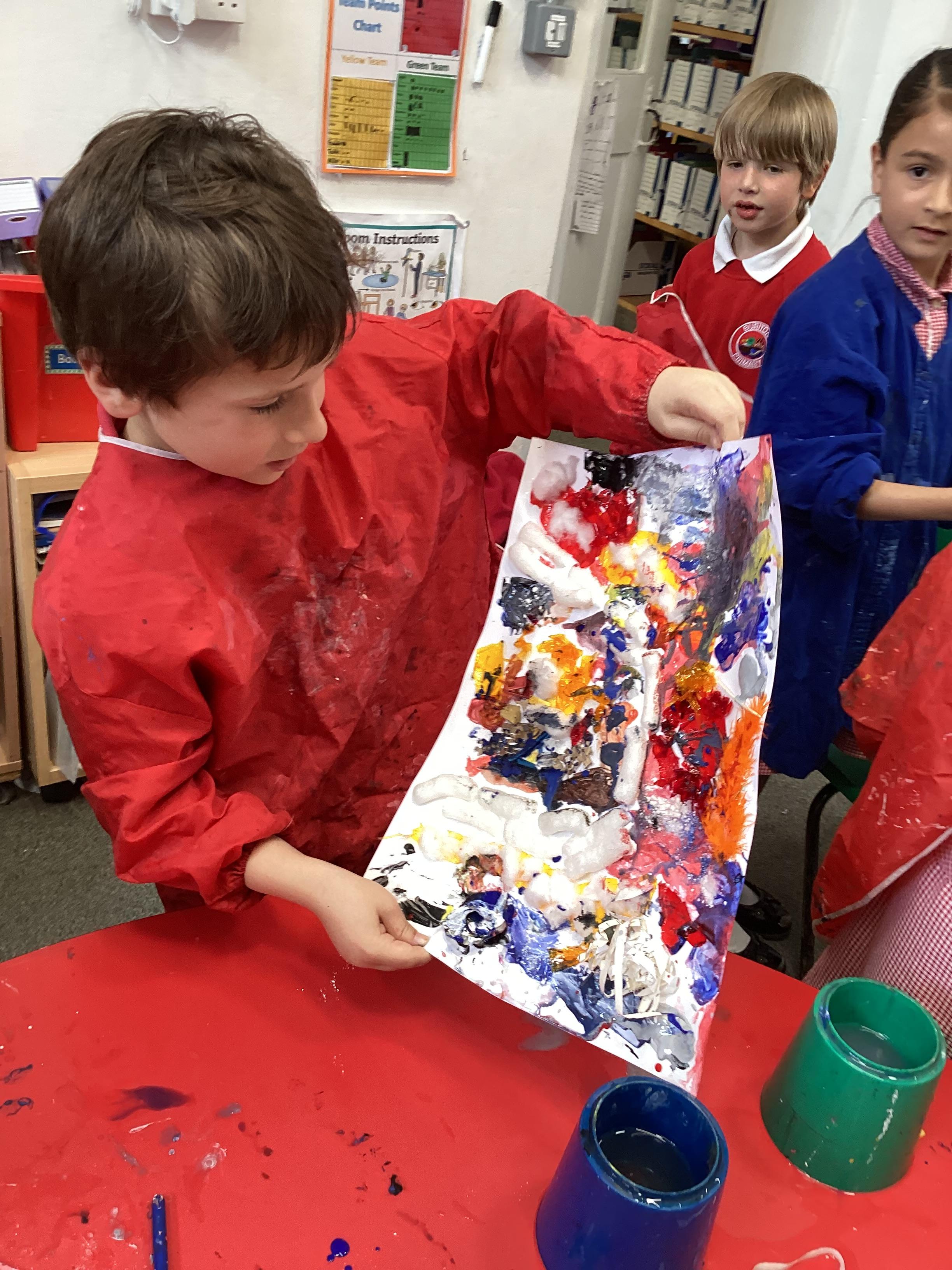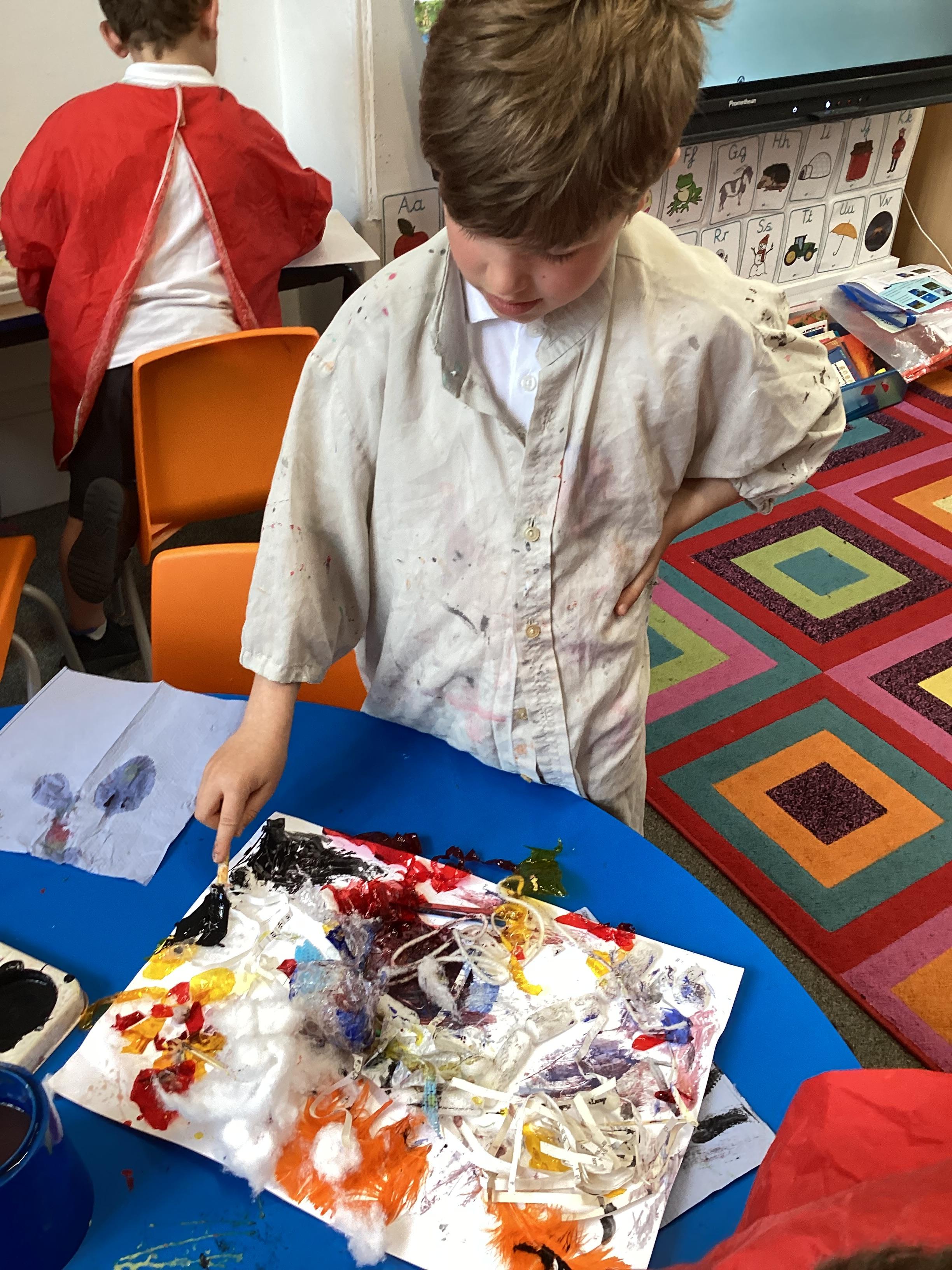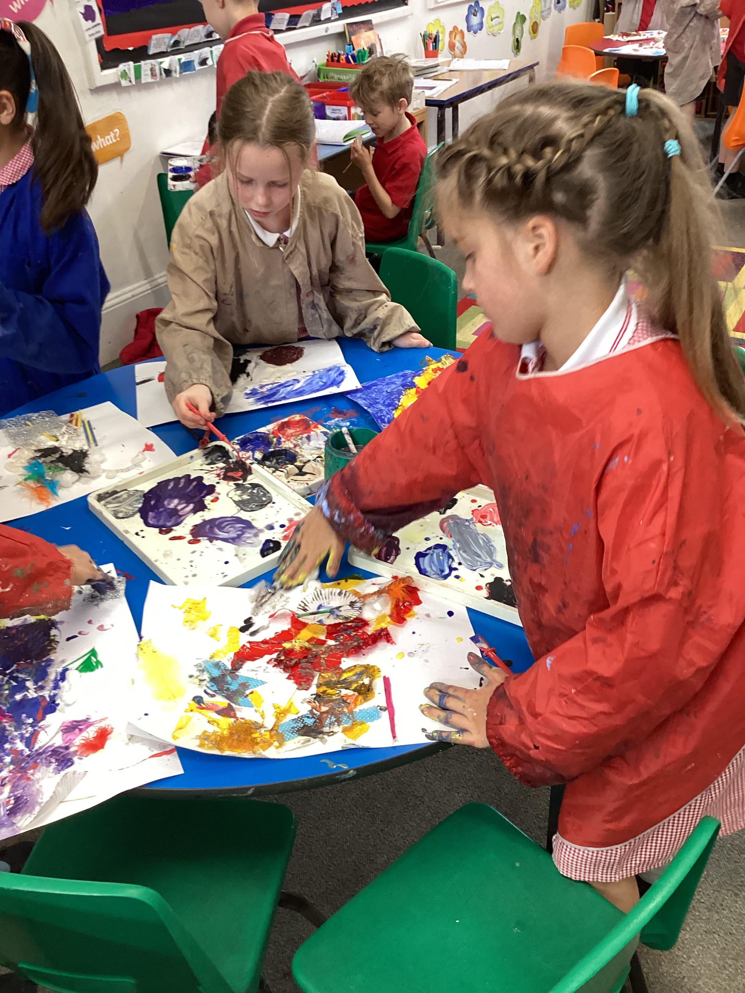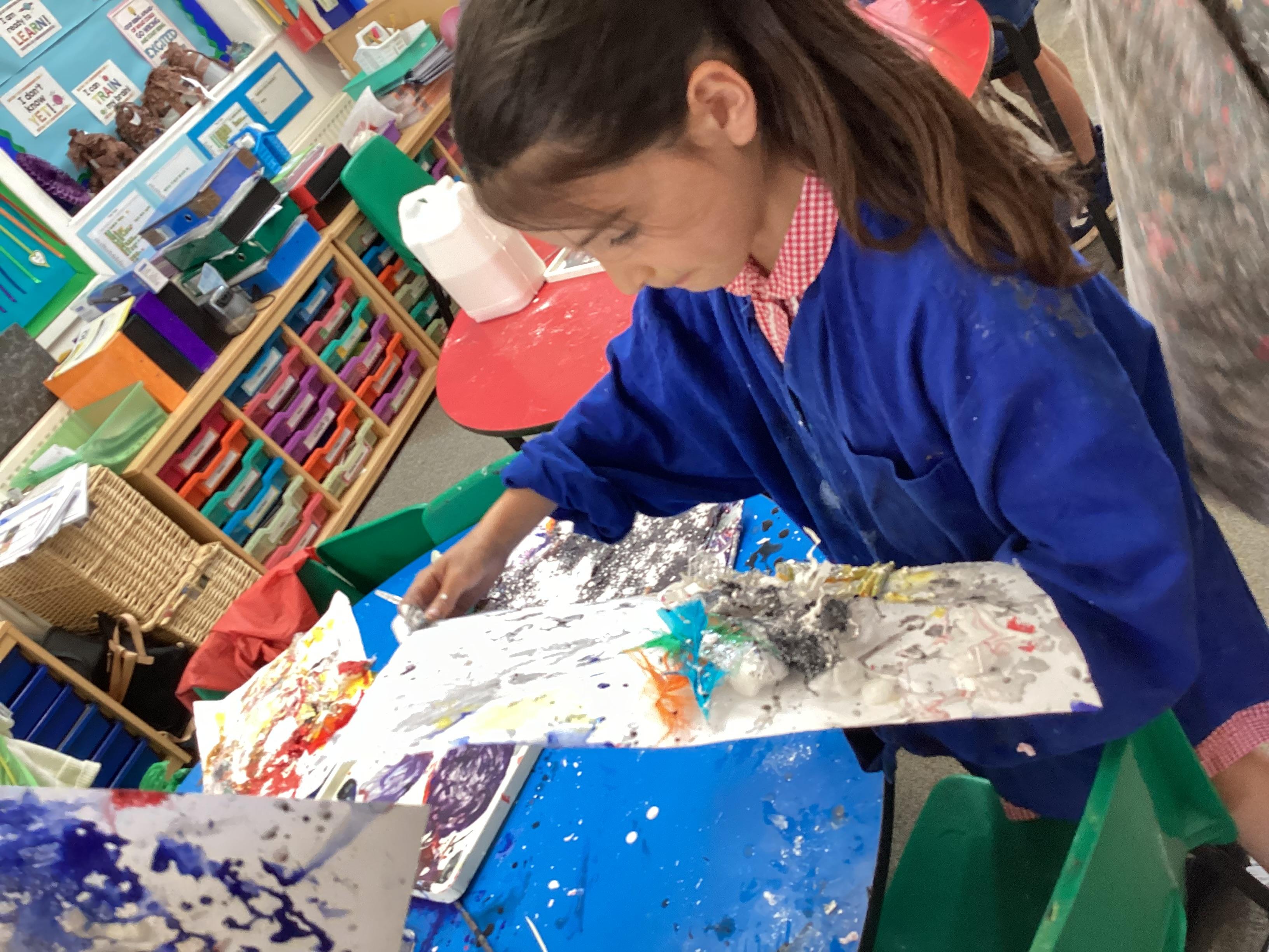 Our current topic is "Violent Volcanoes". We have been exploring the abstract textural art of acclaimed artist Frank Bowling, and, after experimenting with hot/cold colour mixing, and collage, we created our own abstract textured artwork representing "The idea and feeling of a Volcano". We had GREAT FUN exploring different ways of applying and thickening paint , trying to avoid using brushes, and even added dental plaster to our creations to add more texture. (Miss Burrough is still tidying the classroom!!!)