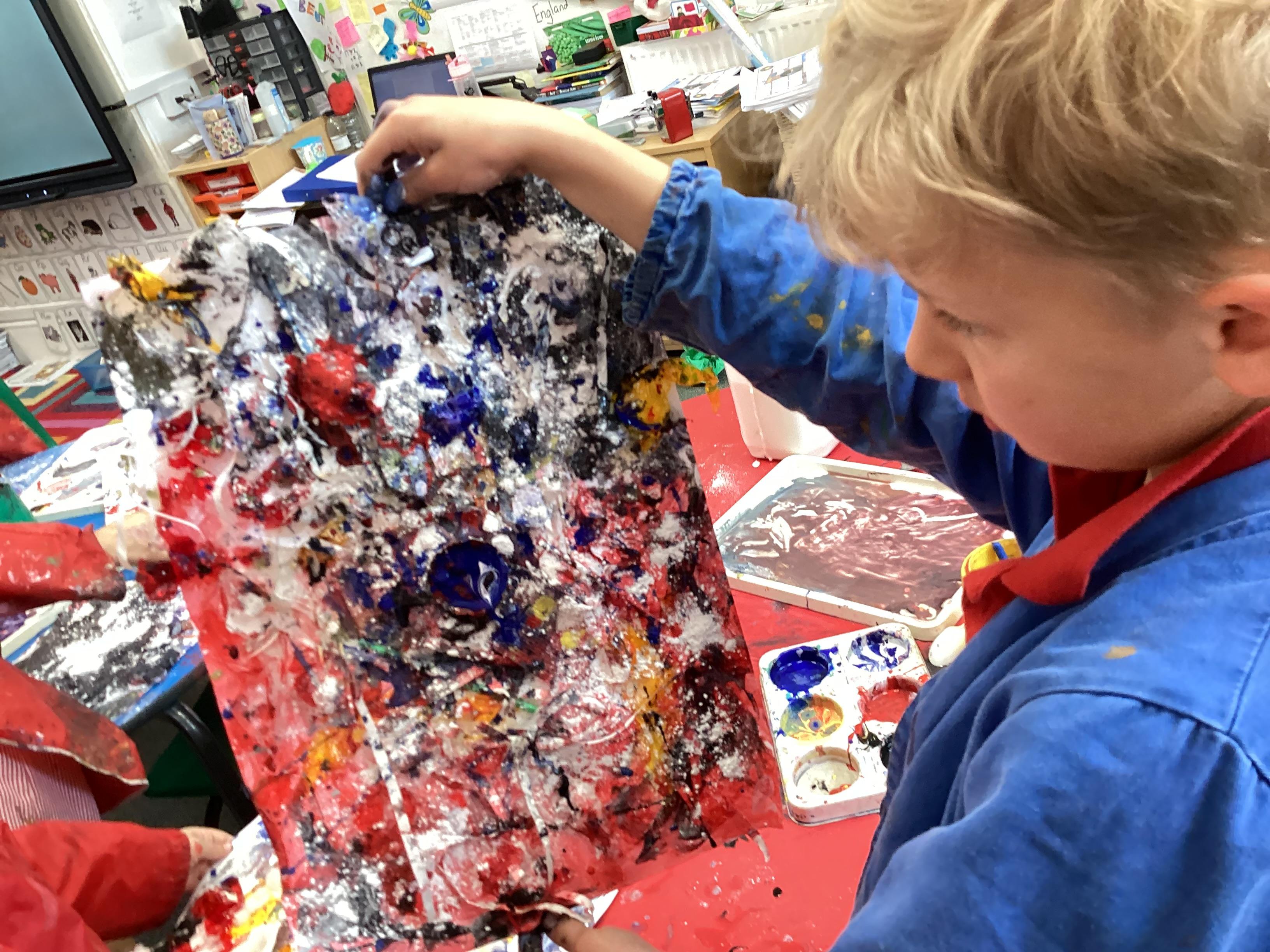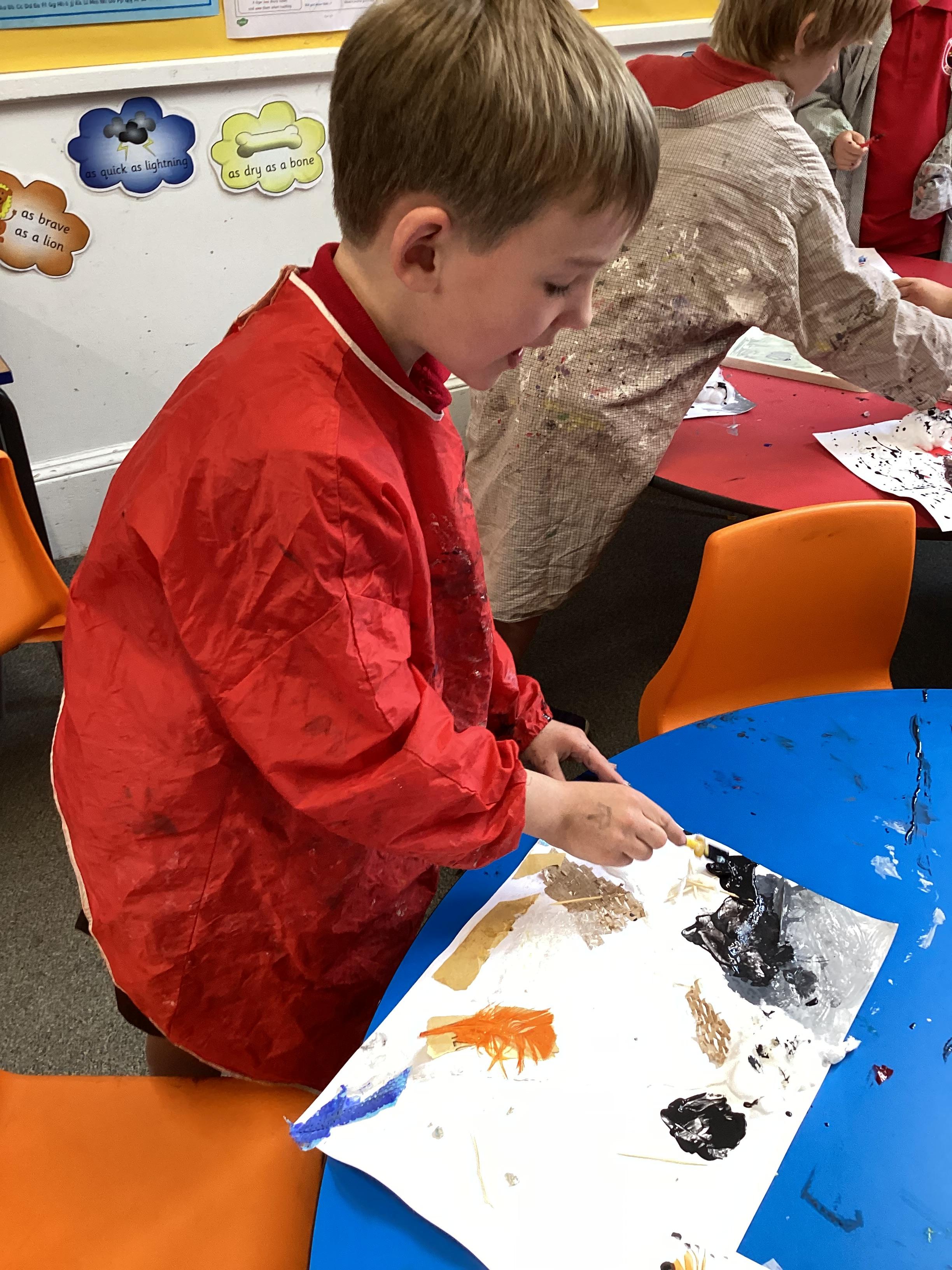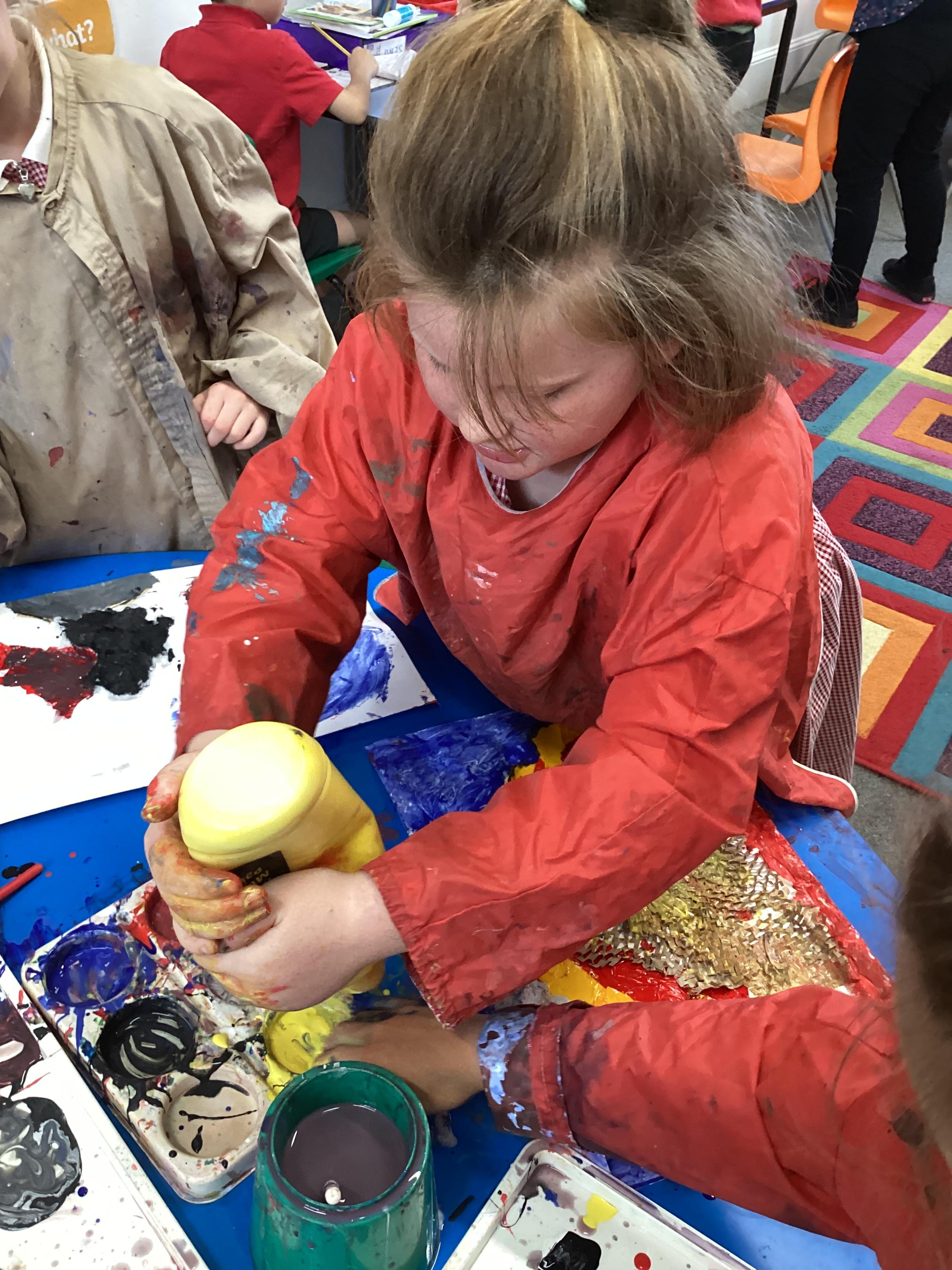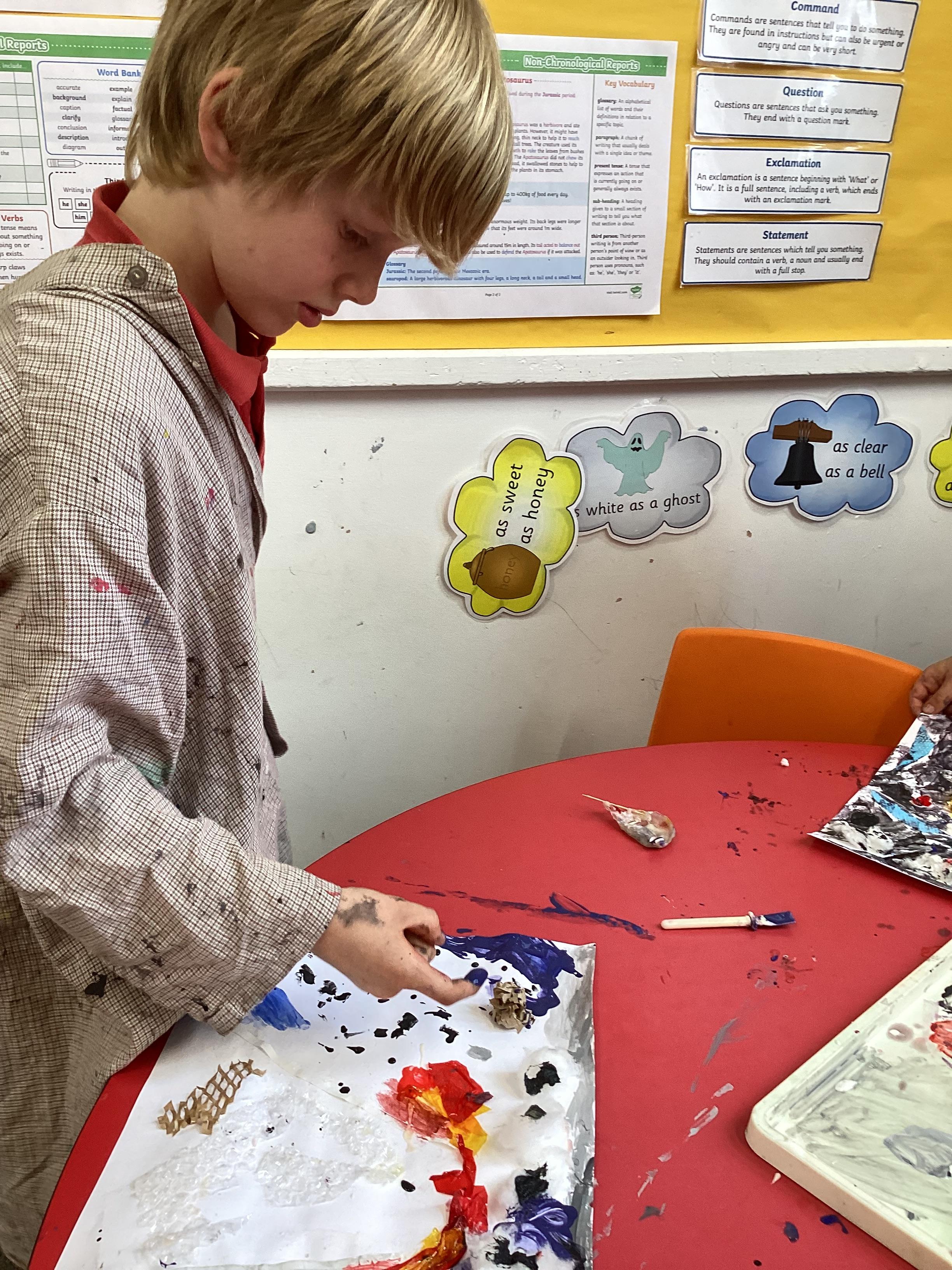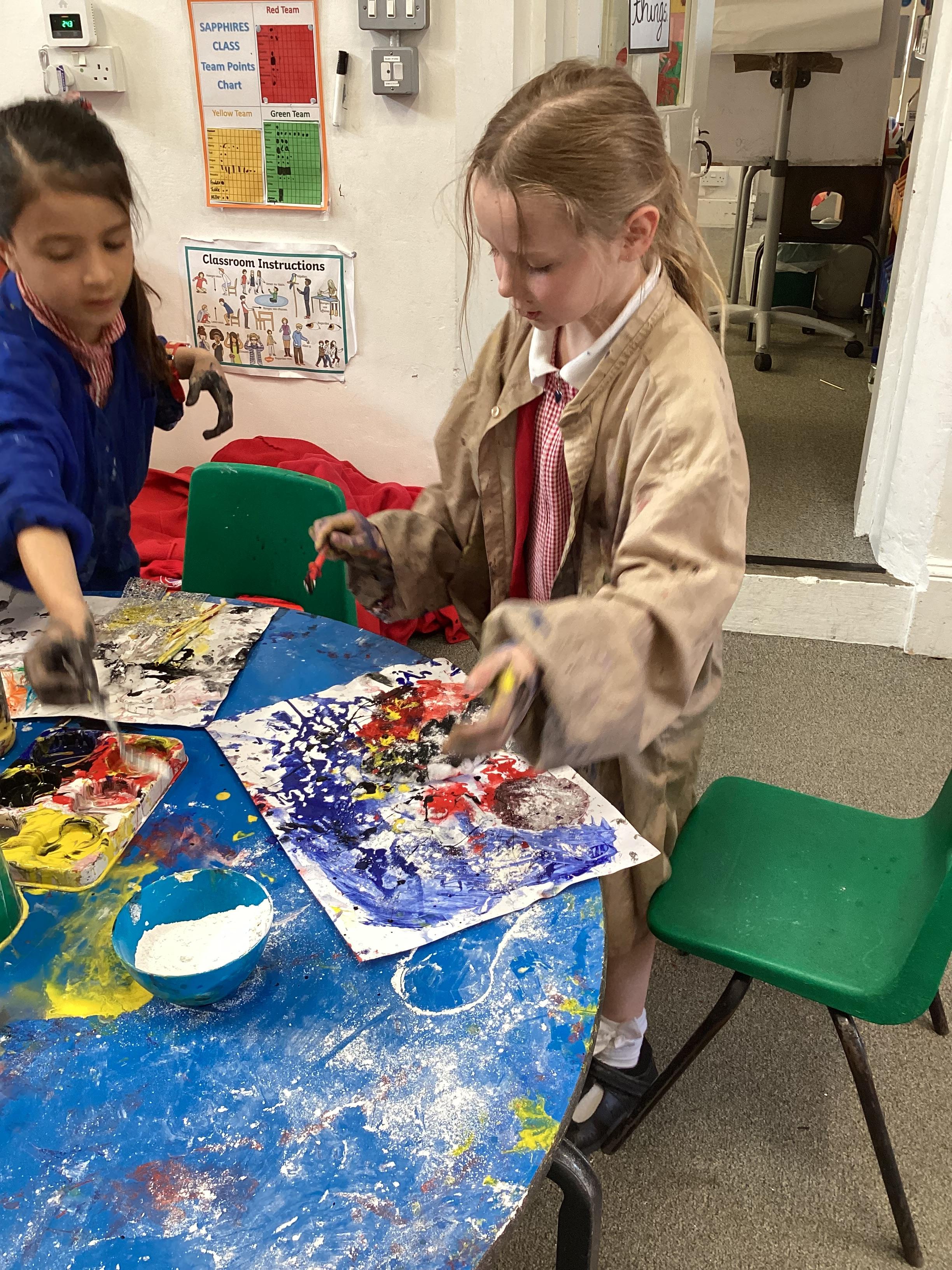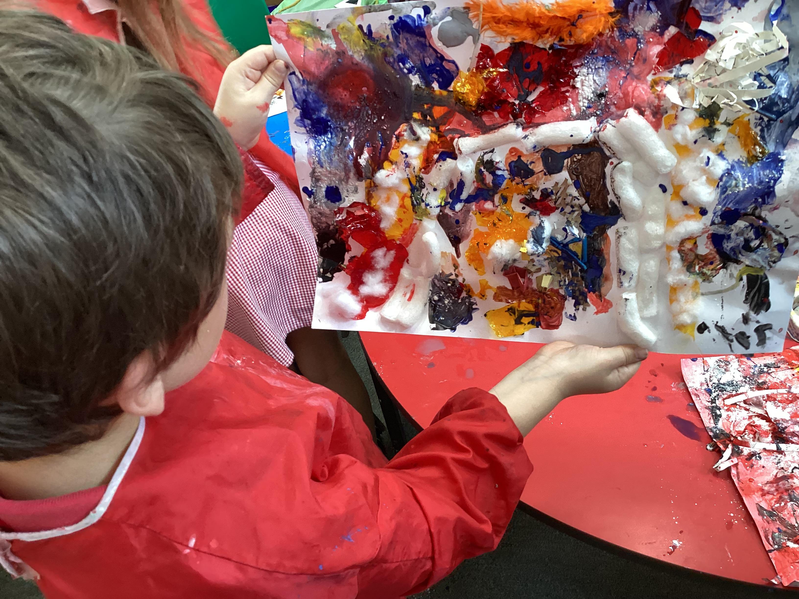Our current topic is "Violent Volcanoes". We have been exploring the abstract textural art of acclaimed artist Frank Bowling, and, after experimenting with hot/cold colour mixing, and collage, we created our own abstract textured artwork representing "The idea and feeling of a Volcano". We had GREAT FUN exploring different ways of applying and thickening paint , trying to avoid using brushes, and even added dental plaster to our creations to add more texture. (Miss Burrough is still tidying the classroom!!!)