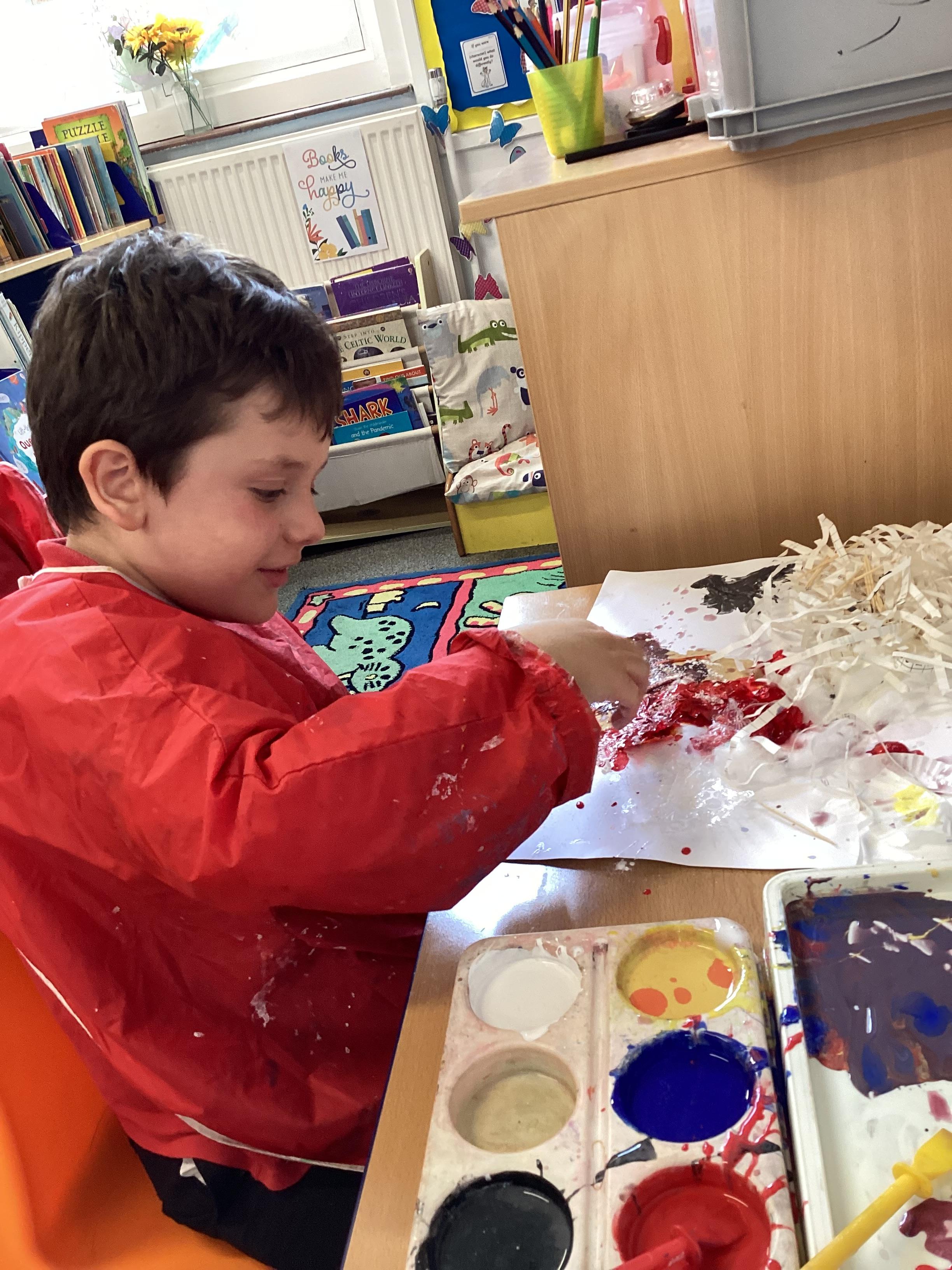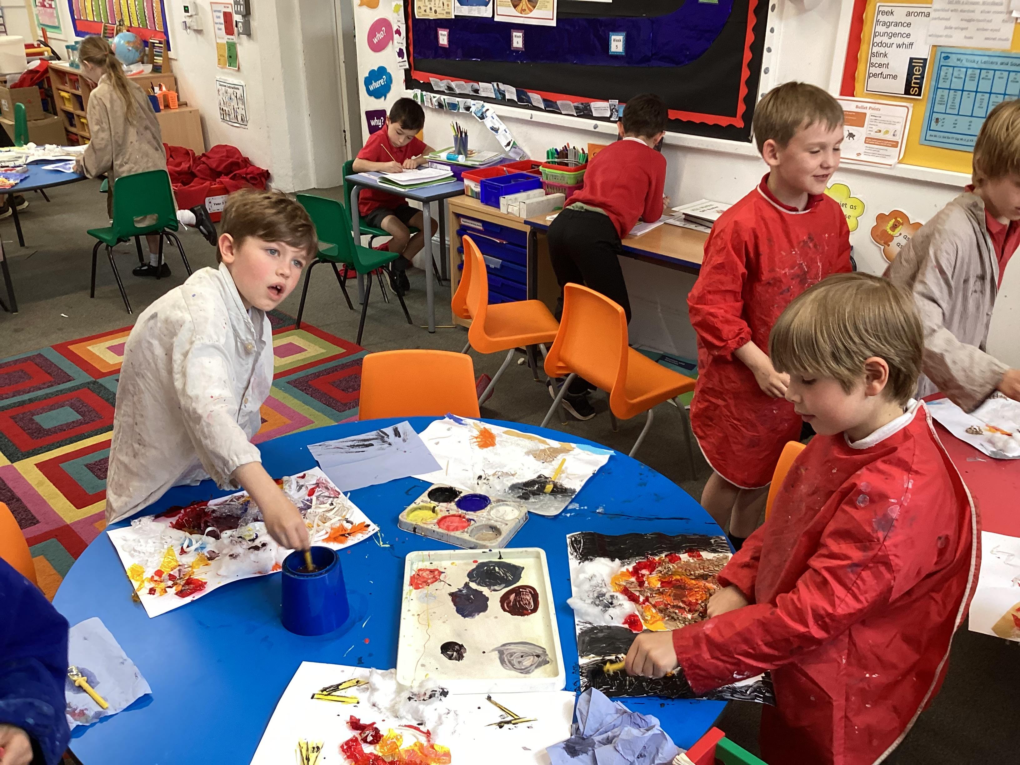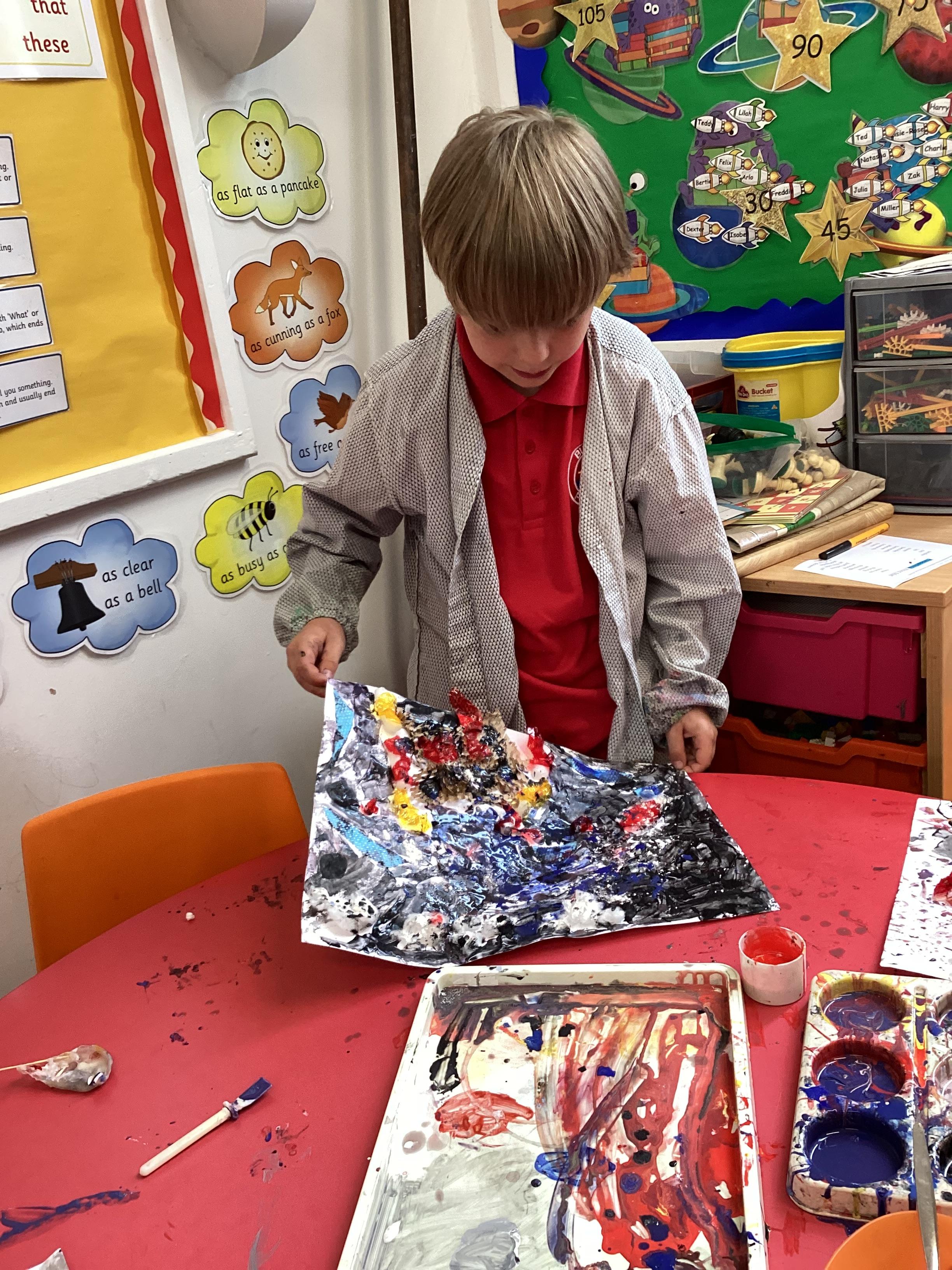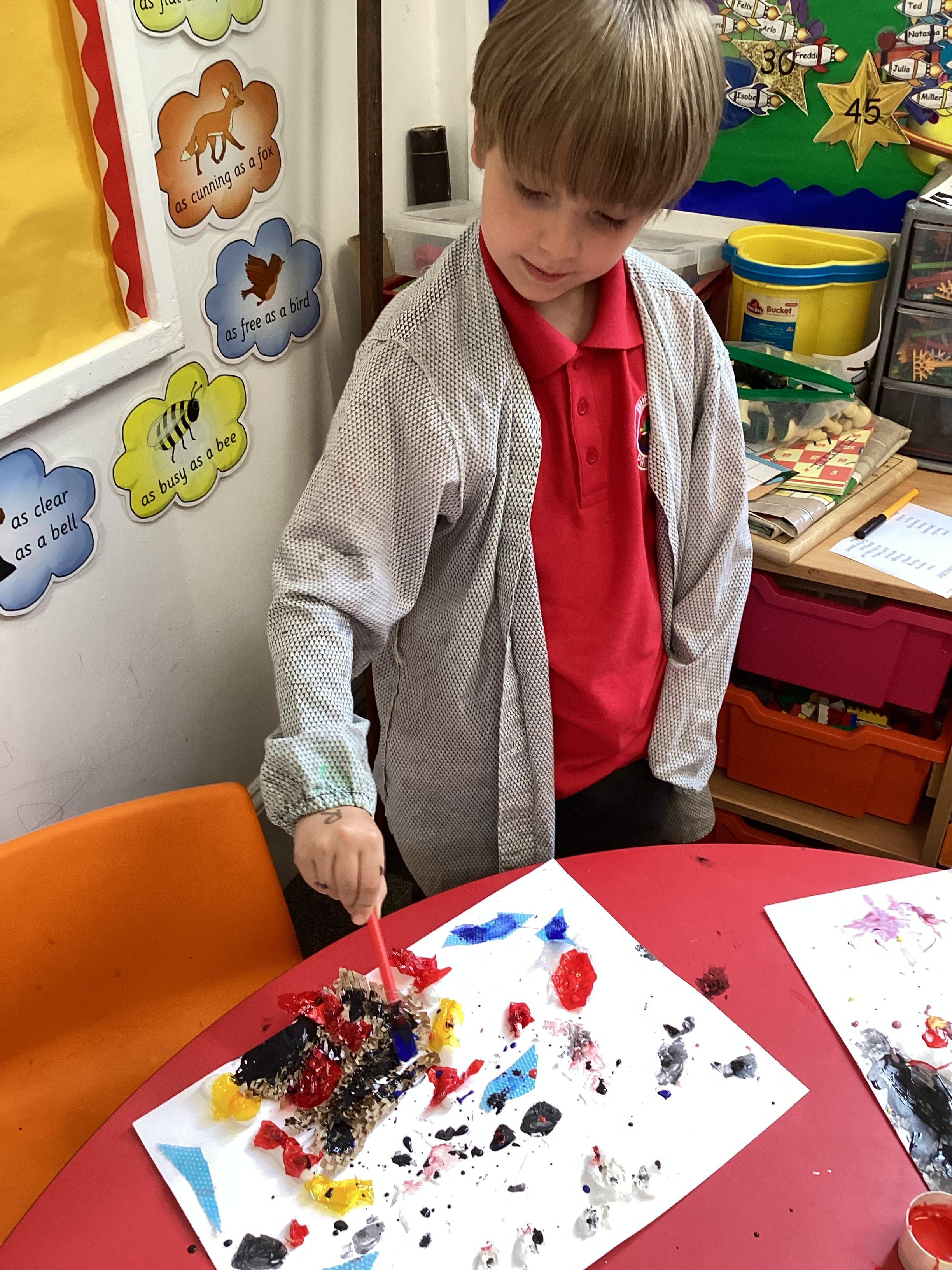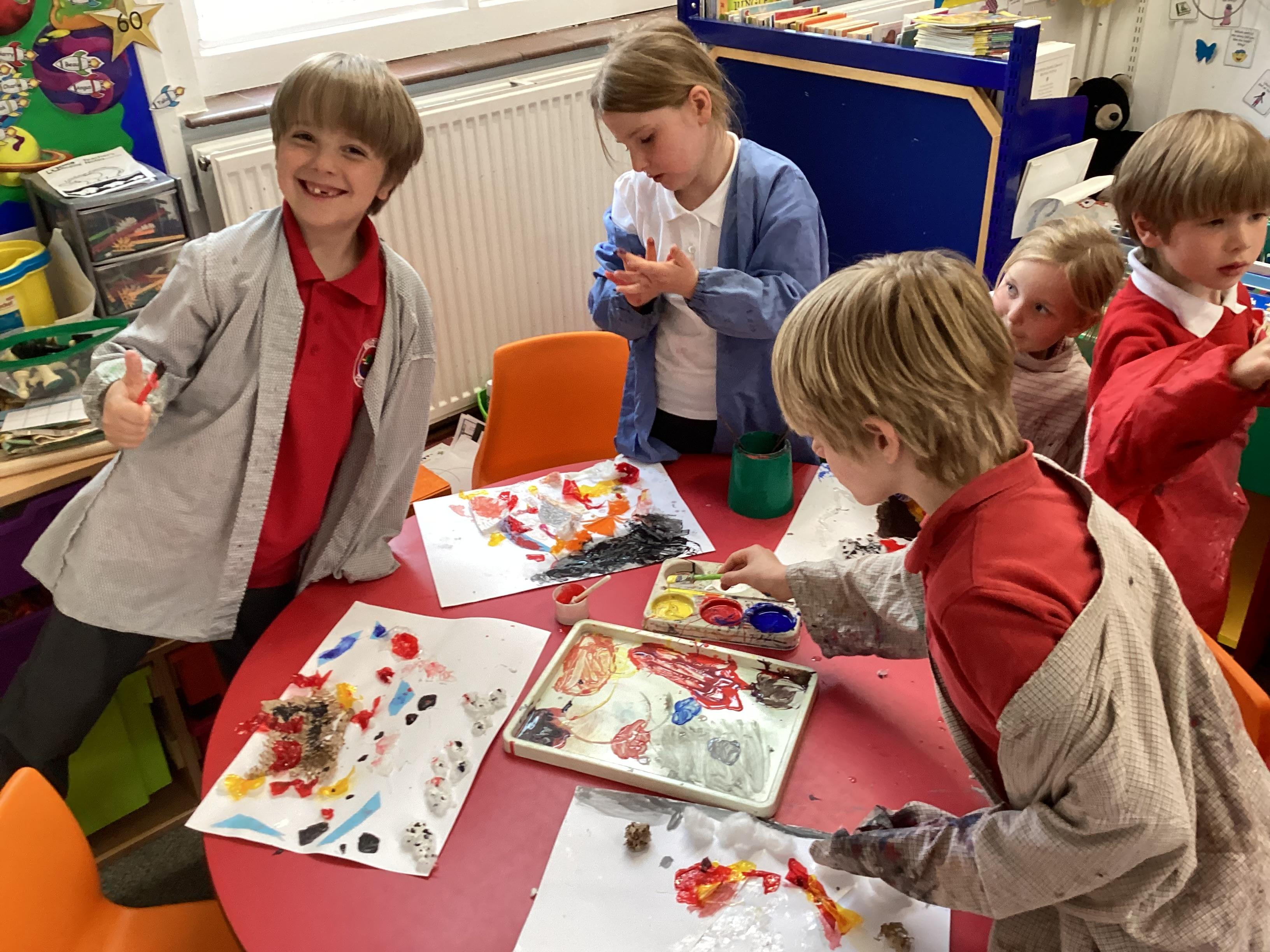 Our current topic is "Violent Volcanoes". We have been exploring the abstract textural art of acclaimed artist Frank Bowling, and, after experimenting with hot/cold colour mixing, and collage, we created our own abstract textured artwork representing "The idea and feeling of a Volcano". We had GREAT FUN exploring different ways of applying and thickening paint , trying to avoid using brushes, and even added dental plaster to our creations to add more texture. (Miss Burrough is still tidying the classroom!!!)