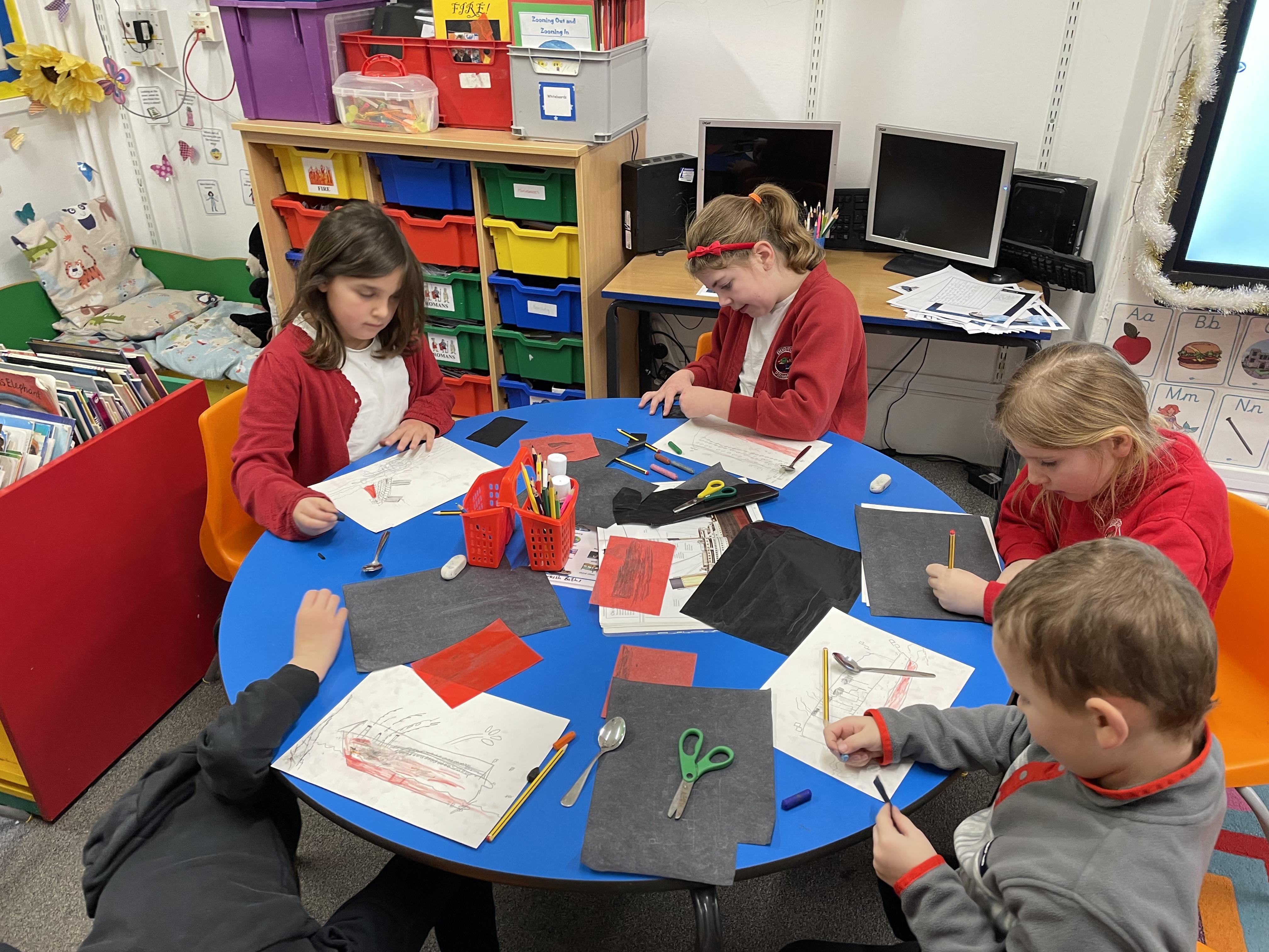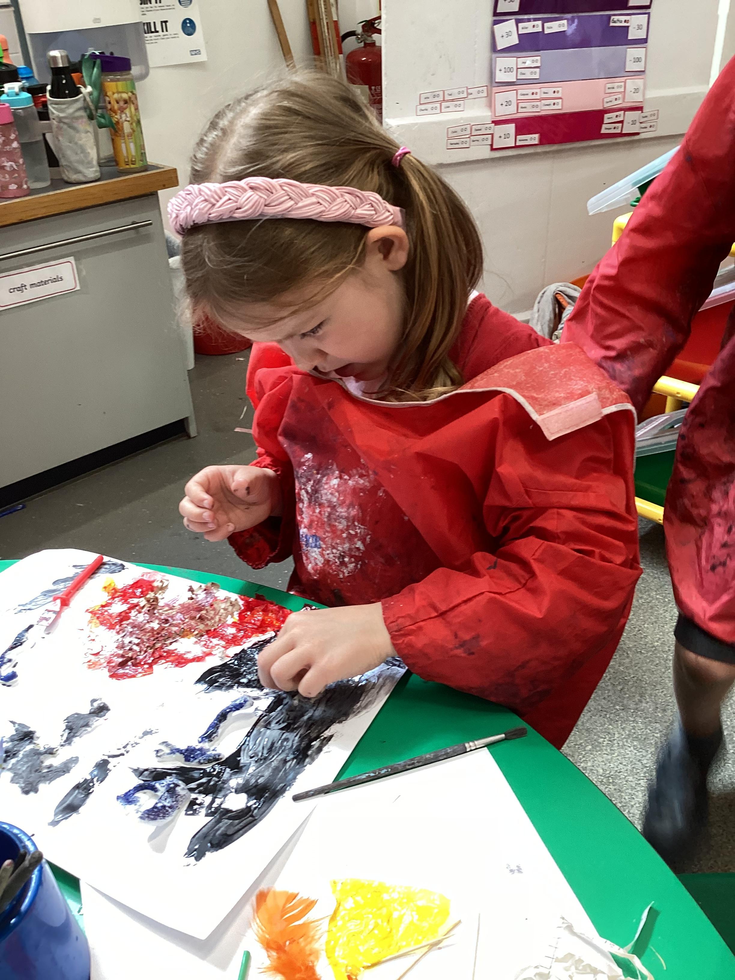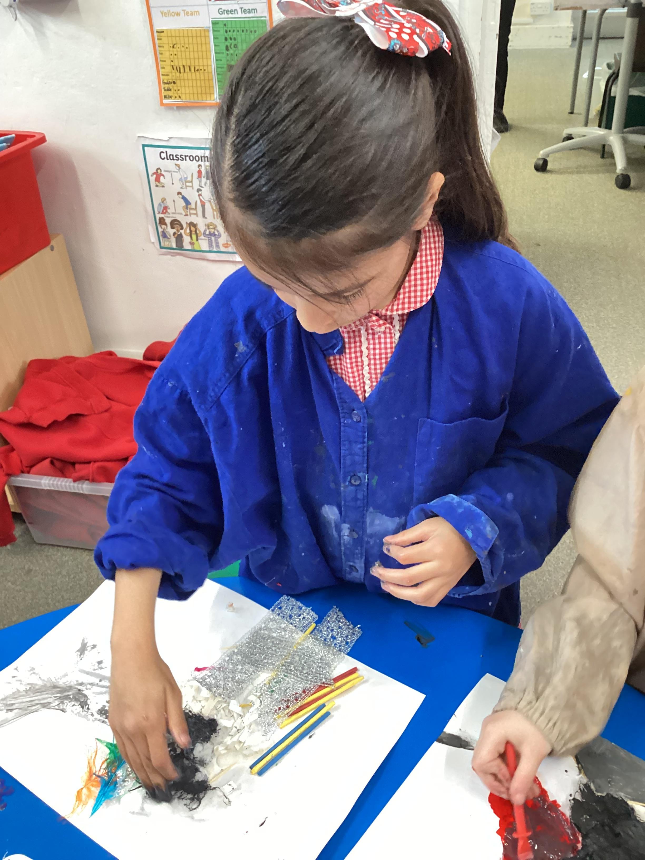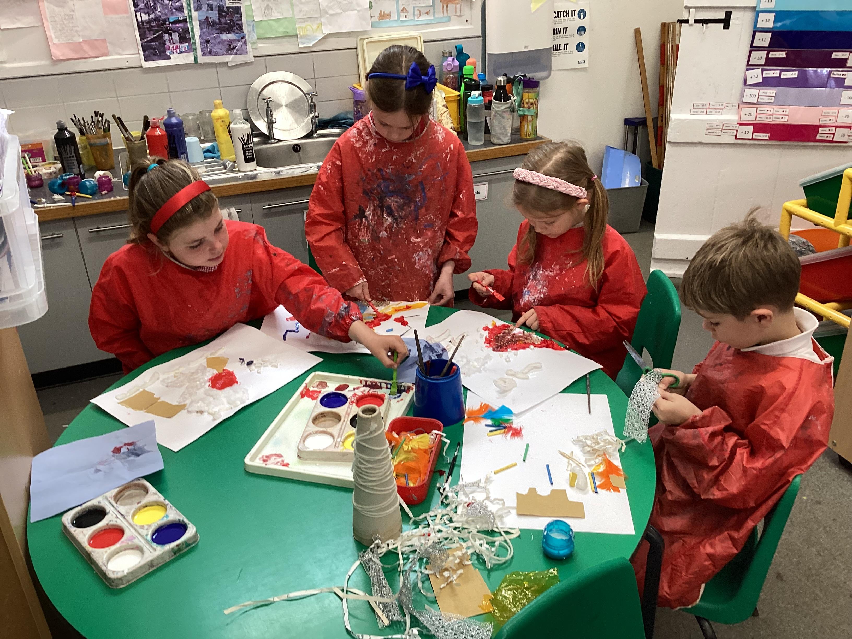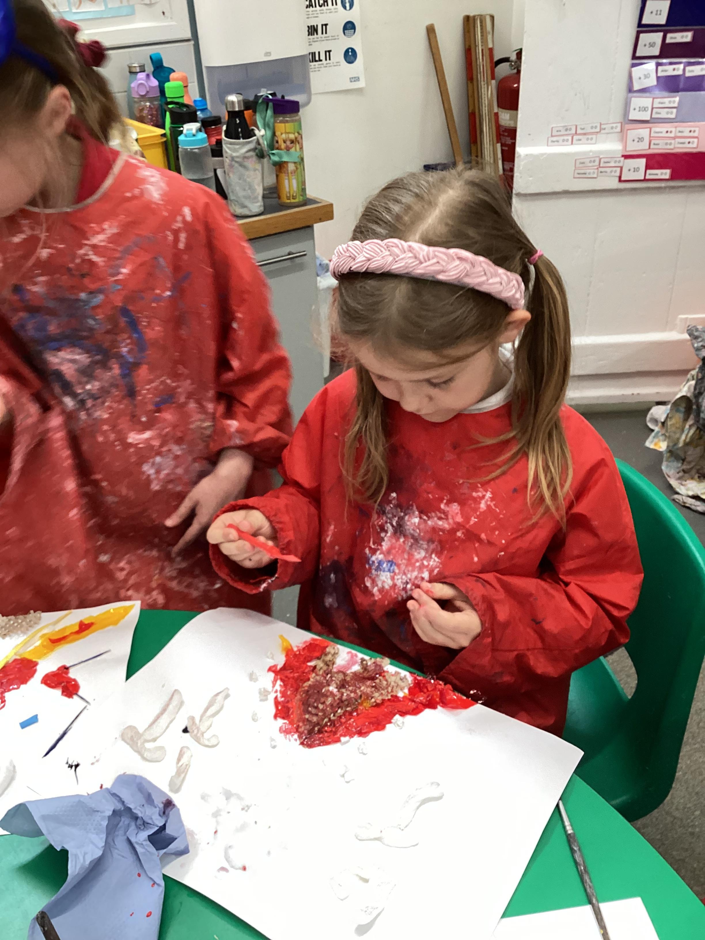 Our current topic is "Violent Volcanoes". We have been exploring the abstract textural art of acclaimed artist Frank Bowling, and, after experimenting with hot/cold colour mixing, and collage, we created our own abstract textured artwork representing "The idea and feeling of a Volcano". We had GREAT FUN exploring different ways of applying and thickening paint , trying to avoid using brushes, and even added dental plaster to our creations to add more texture. (Miss Burrough is still tidying the classroom!!!)